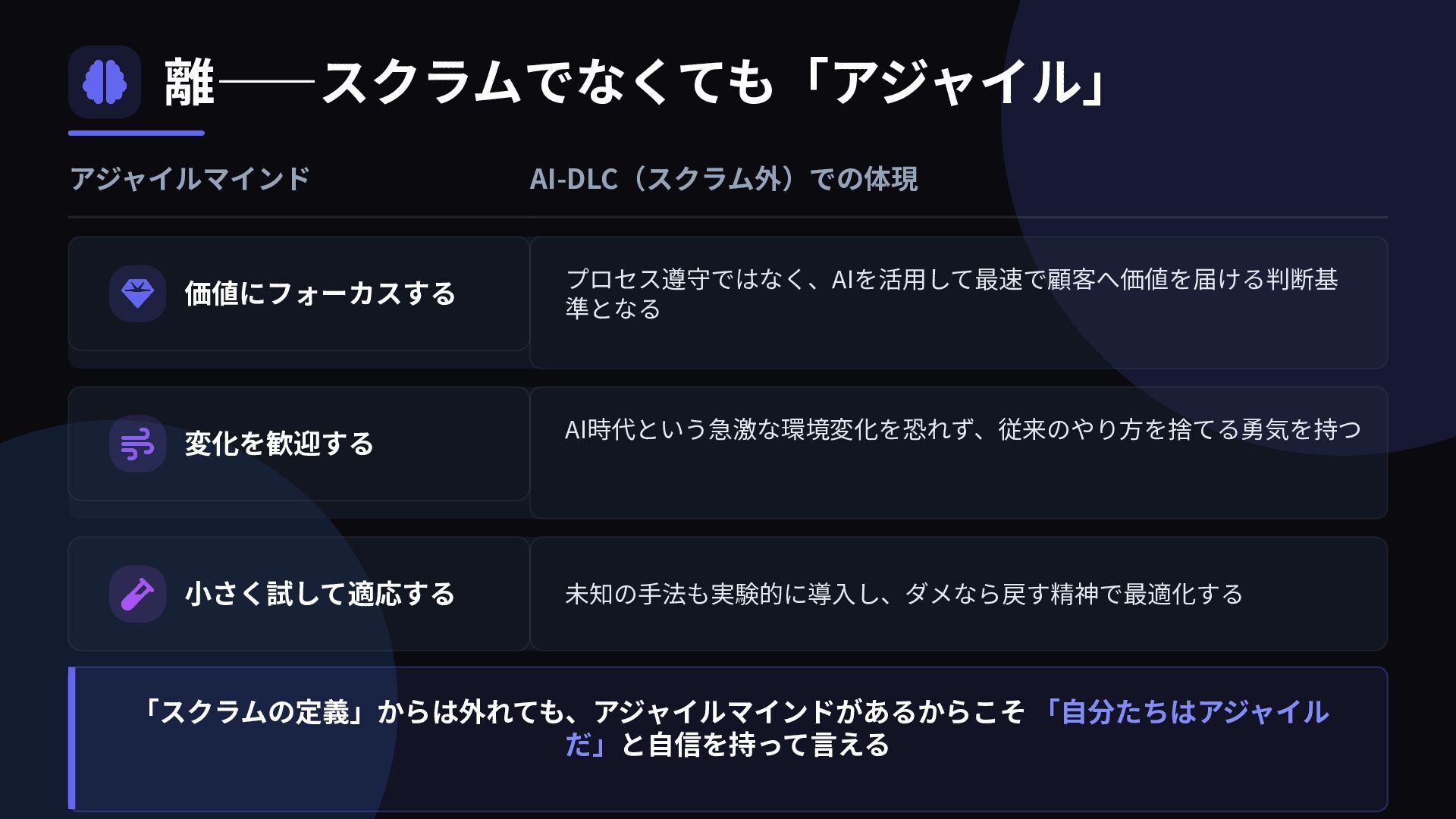離――スクラムでなくても「アジャイル」 アジャイルマインド AI-DLC(スクラム外)での体現 プロセス遵守ではなく、AIを活⽤して最速で顧客へ価値を届ける判断基 準となる AI時代という急激な環境変化を恐れず、従来のやり⽅を捨てる勇気を持つ 未知の⼿法も実験的に導⼊し、ダメなら戻す精神で最適化する 価値にフォーカスする 変化を歓迎する ⼩さく試して適応する