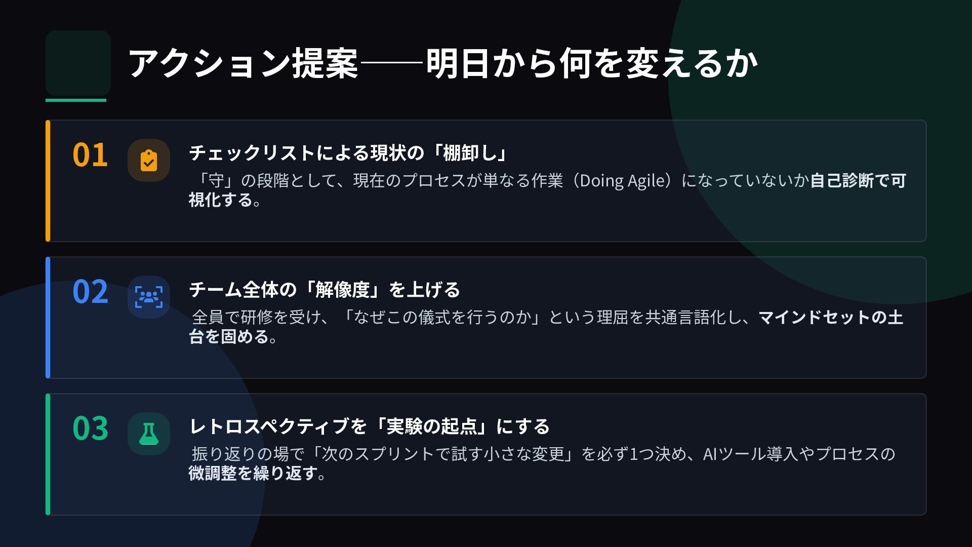 アクション提案――明⽇から何を変えるか チェックリストによる現状の「棚卸し」 「守」の段階として、現在のプロセスが単なる作業(Doing Agile)になっていないか⾃⼰診断で可 視化する。 チーム全体の「解像度」を上げる 全員で研修を受け、「なぜこの儀式を⾏うのか」という理屈を共通⾔語化し、マインドセットの⼟ 台を固める。 レトロスペクティブを「実験の起点」にする 振り返りの場で「次のスプリントで試す⼩さな変更」を必ず1つ決め、AIツール導⼊やプロセスの