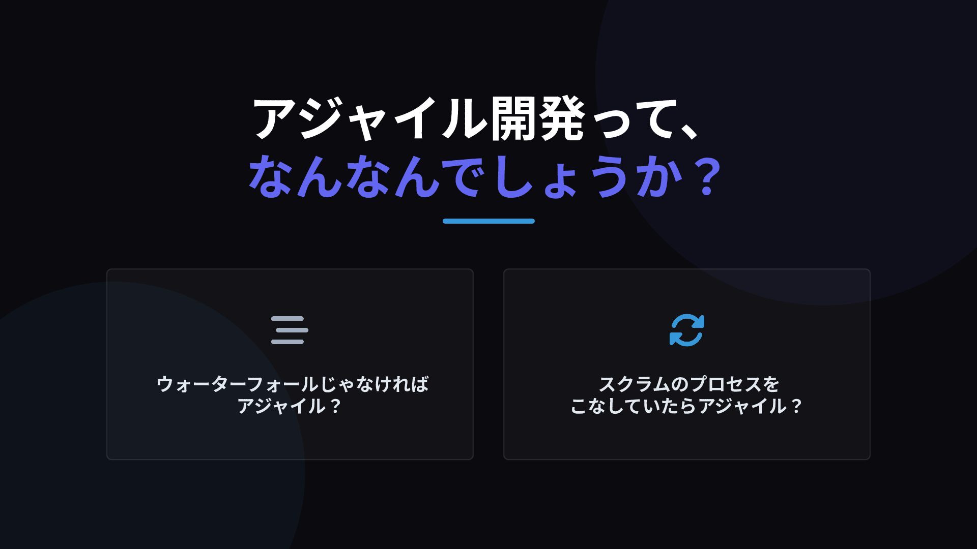 アジャイル開発って、 なんなんでしょうか? ウォーターフォールじゃなければ アジャイル? スクラムのプロセスを こなしていたらアジャイル?