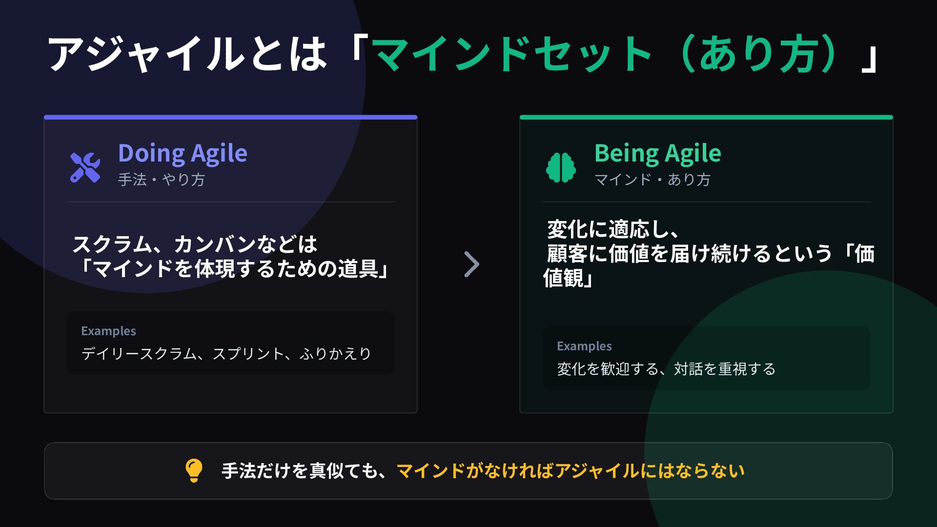 アジャイルとは「マインドセット(あり⽅)」 Doing Agile ⼿法‧やり⽅ スクラム、カンバンなどは 「マインドを体現するための道具」 Examples デイリースクラム、スプリント、ふりかえり Being Agile