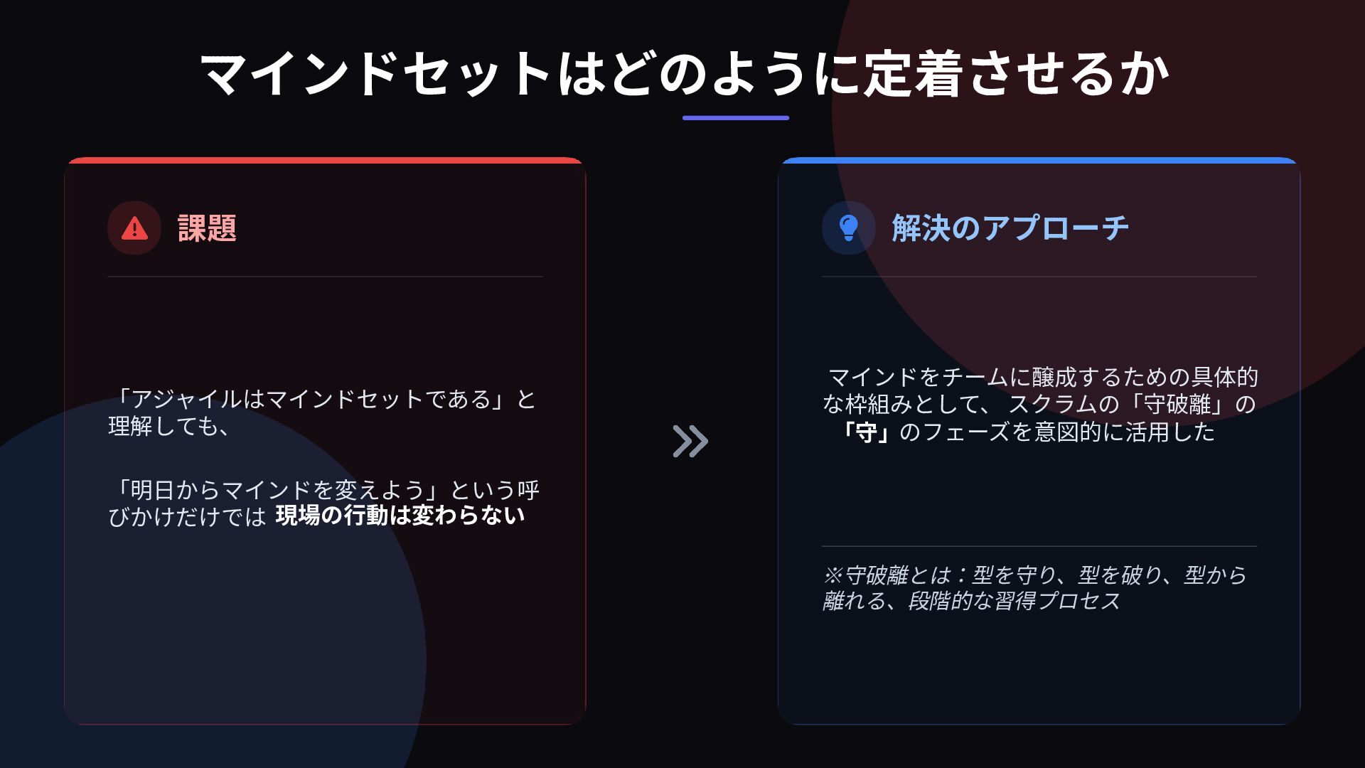 マインドセットはどのように定着させるか 課題 「アジャイルはマインドセットである」と 理解しても、 「明⽇からマインドを変えよう」という呼 びかけだけでは 現場の⾏動は変わらない 解決のアプローチ マインドをチームに醸成するための具体的 な枠組みとして、