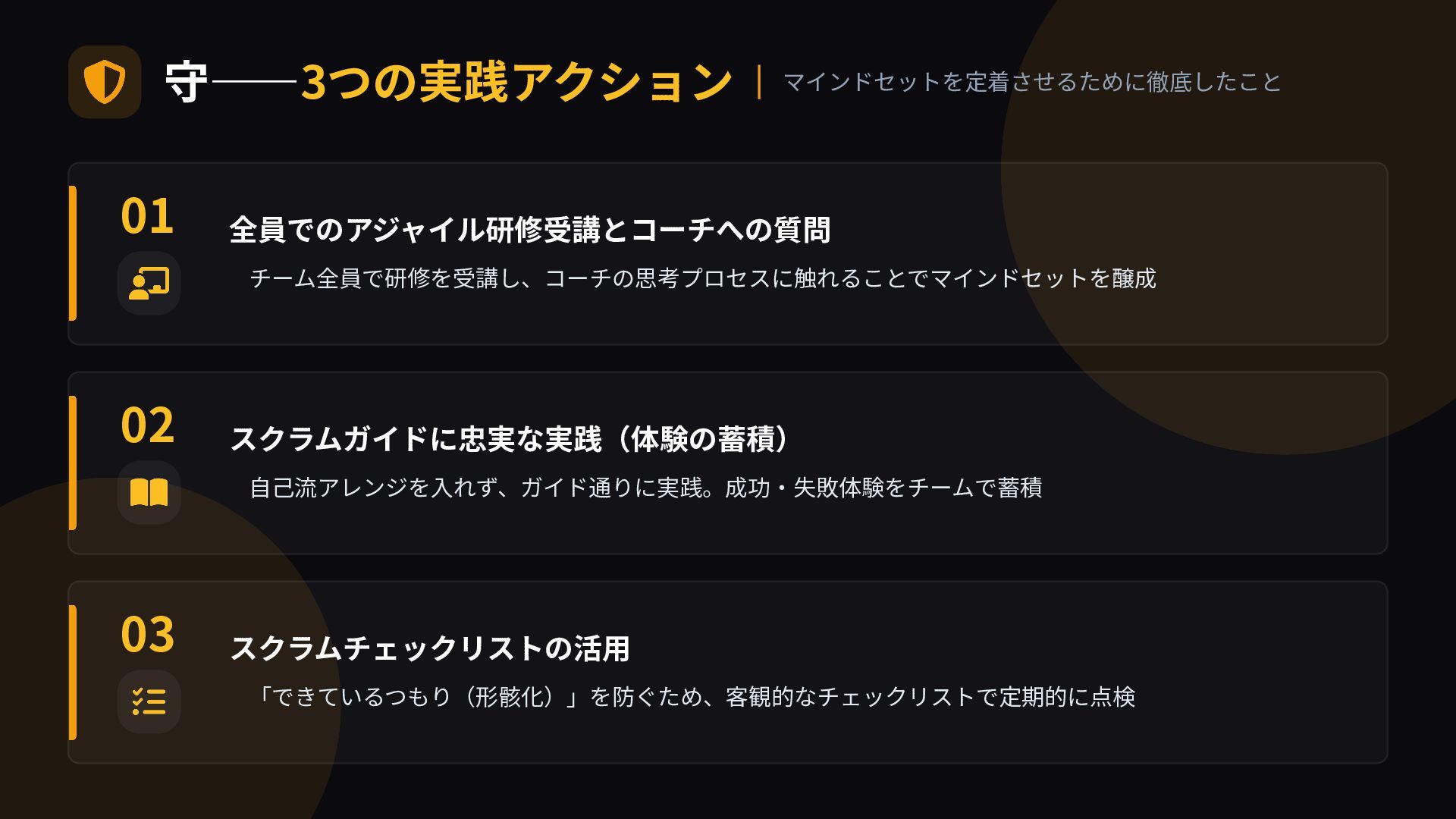 守――3つの実践アクション マインドセットを定着させるために徹底したこと 01 全員でのアジャイル研修受講とコーチへの質問 チーム全員で研修を受講し、コーチの思考プロセスに触れることでマインドセットを醸成 02 スクラムガイドに忠実な実践(体験の蓄積) ⾃⼰流アレンジを⼊れず、ガイド通りに実践。成功‧失敗体験をチームで蓄積 03 スクラムチェックリストの活⽤