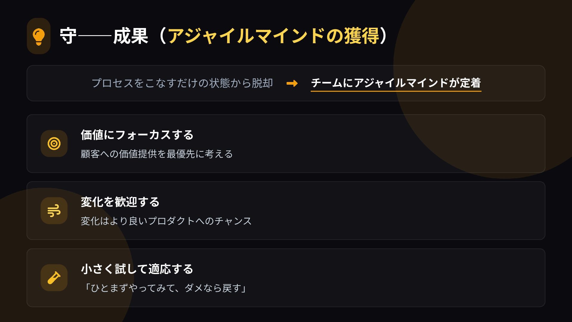 守――成果(アジャイルマインドの獲得) プロセスをこなすだけの状態から脱却 チームにアジャイルマインドが定着 価値にフォーカスする 顧客への価値提供を最優先に考える 変化を歓迎する 変化はより良いプロダクトへのチャンス ⼩さく試して適応する 「ひとまずやってみて、ダメなら戻す」