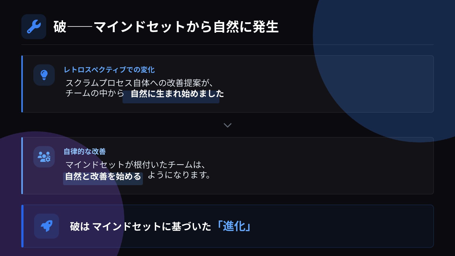 破――マインドセットから⾃然に発⽣ スクラムプロセス⾃体への改善提案が、 チームの中から マインドセットが根付いたチームは、 ようになります。 破は マインドセットに基づいた「進化」 ⾃然に⽣まれ始めました ⾃然と改善を始める レトロスペクティブでの変化