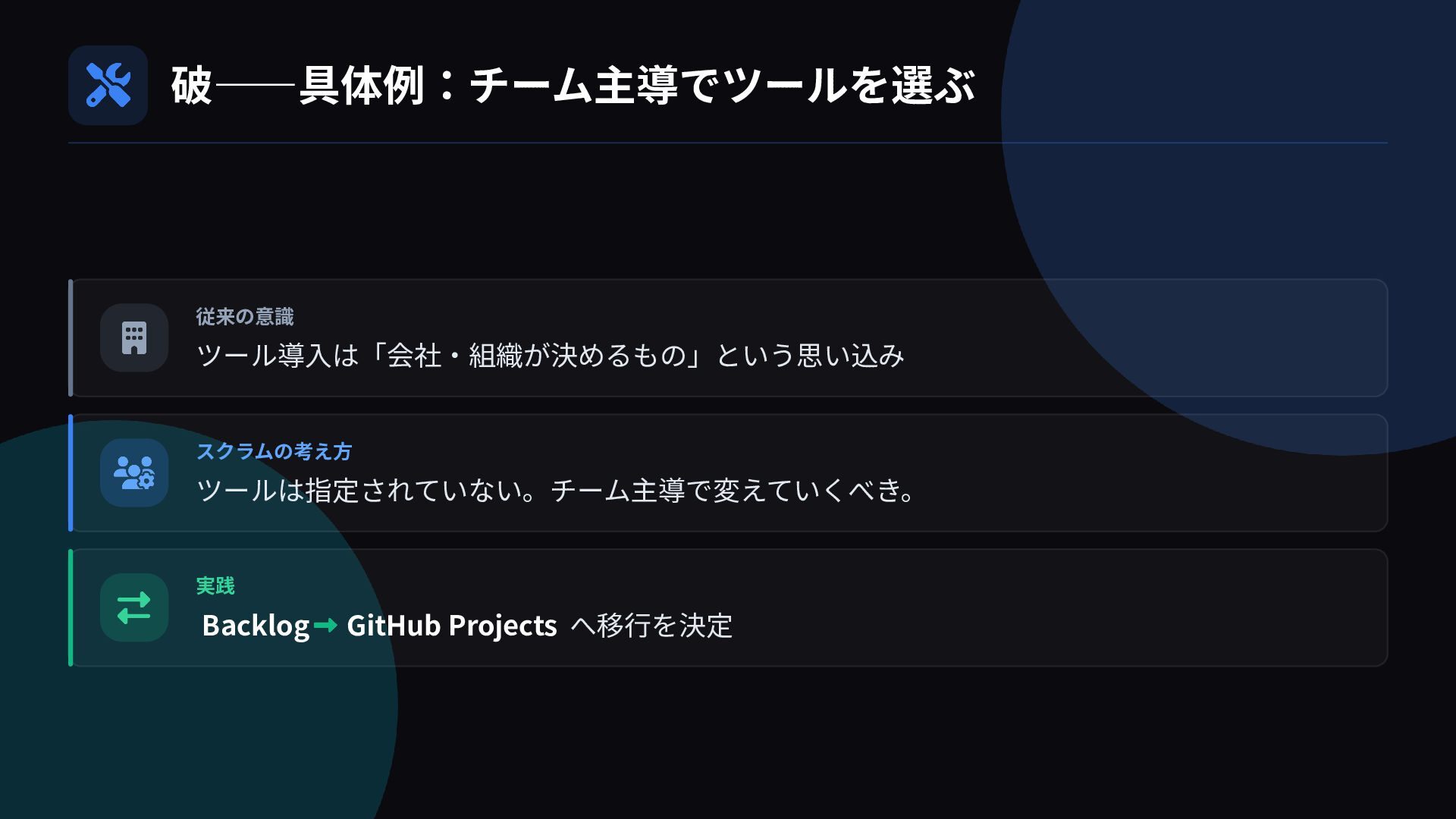 破――具体例:チーム主導でツールを選ぶ ツール導⼊は「会社‧組織が決めるもの」という思い込み ツールは指定されていない。チーム主導で変えていくべき。 Backlog GitHub Projects へ移⾏を決定 従来の意識 スクラムの考え⽅ 実践