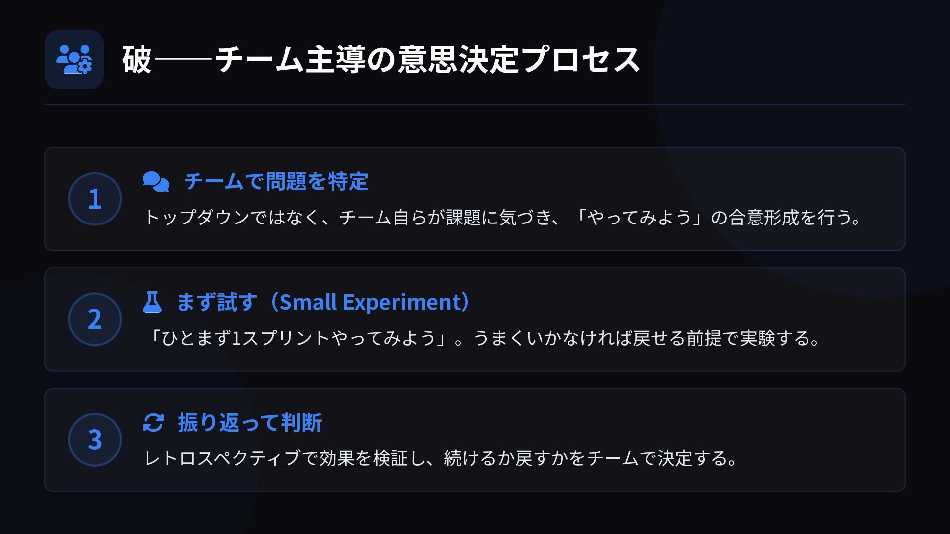 破――チーム主導の意思決定プロセス 1 チームで問題を特定 トップダウンではなく、チーム⾃らが課題に気づき、「やってみよう」の合意形成を⾏う。 2 まず試す(Small Experiment) 「ひとまず1スプリントやってみよう」。うまくいかなければ戻せる前提で実験する。 3 振り返って判断