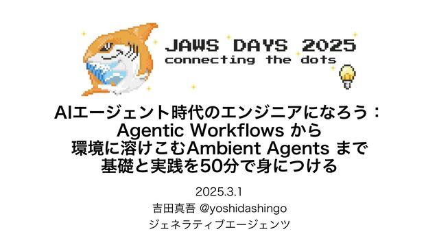2025.3.1 JAWS DAYS 2025で発表した資料です。 AIエージェント時代のエンジニアになろう:Agentic Workflows から環境に溶けこむAmbient Agents まで基礎と実践を50分で身につける