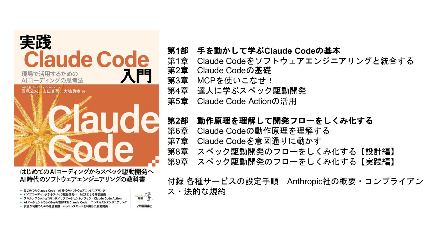 MCPを使いこなせ! 第4章 達人に学ぶスペック駆動開発 第5章 Claude Code Actionの活用 第2部 動作原理を理解して開発フローをしくみ化する 第6章 Claude Codeの動作原理を理解する 第7章 Claude Codeを意図通りに動かす 第8章 スペック駆動開発のフローをしくみ化する【設計編】 第9章 スペック駆動開発のフローをしくみ化する【実践編】 付録 各種サービスの設定手順 Anthropic社の概要・コンプライアン ス・法的な規約