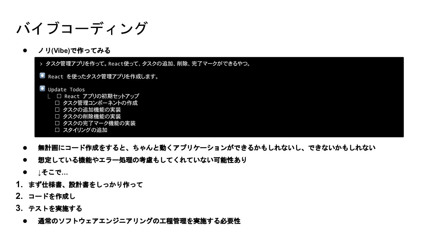 7. バイブコーディング • ノリ(Vibe)で作ってみる • 無計画にコード作成をすると、ちゃんと動くアプリケーションができるかもしれないし、できないかもしれない • 想定している機能やエラー処理の考慮もしてくれていない可能性あり • ↓そこで… 1.