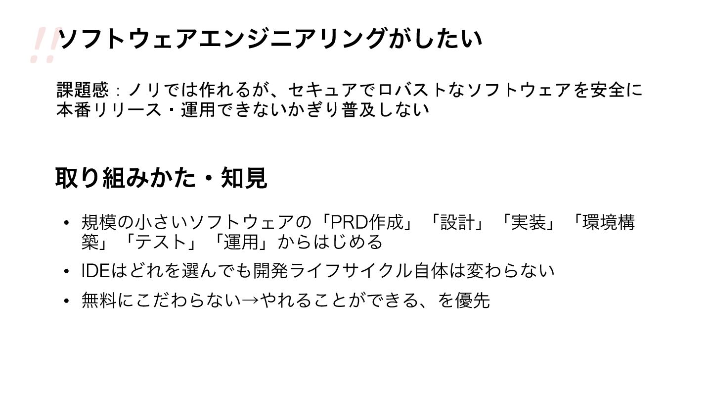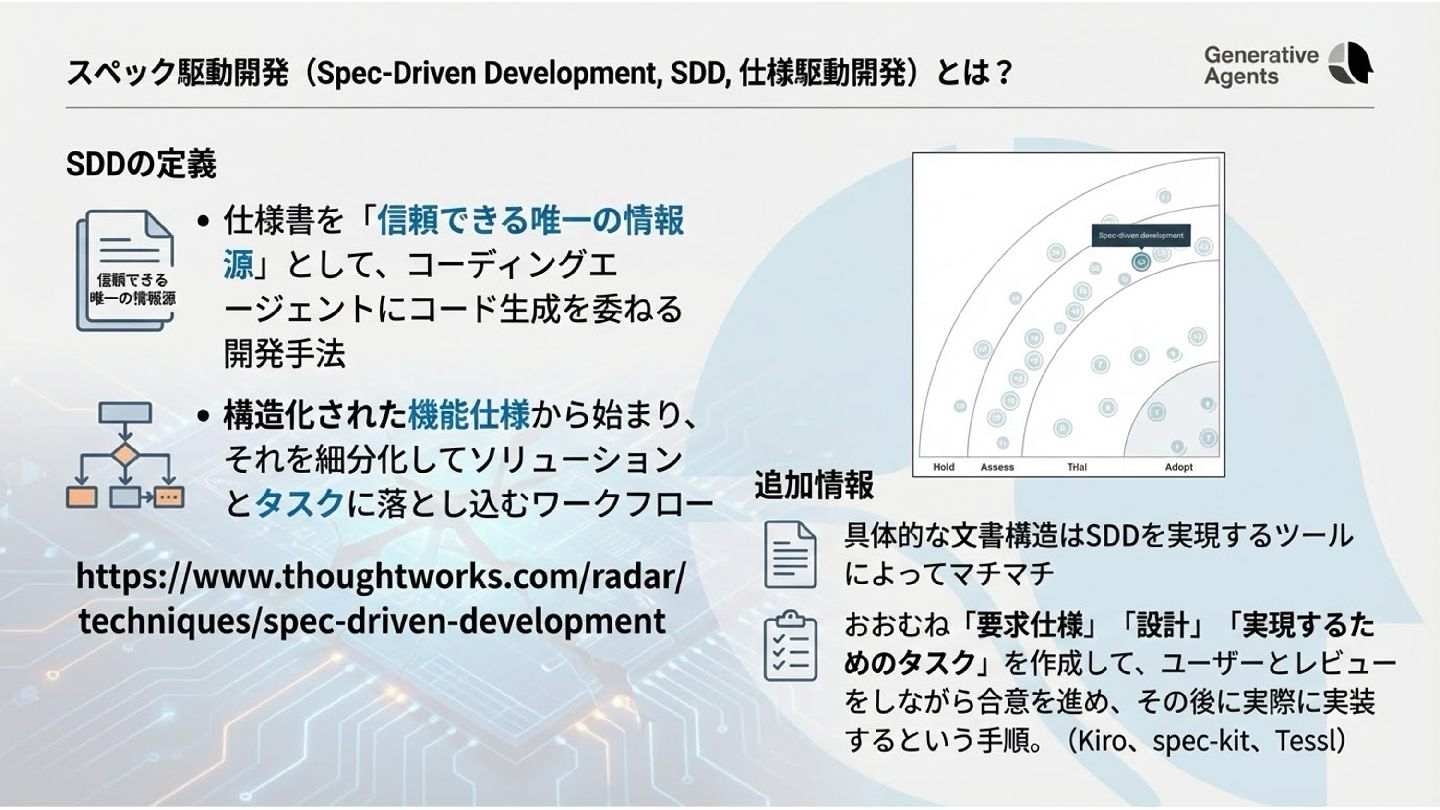 (Design Doc) アーキテクチャと技術的設計を 記述 コンポーネント図、API仕様、デ ータモデル ユビキタス言語 (Ubiquitous Language) ドメインの用語をチーム内で統 一 用語集、ドメインモデル図 テスト仕様 (Test Spec) 期待する振る舞いを事前に定義 テストケース、受入基準 実行計画書 (Task Plan) 実装の順序と単位を規定 タスクリスト、スプリントバックロ グ 開発を支える「仕様」の構成要素 etc…