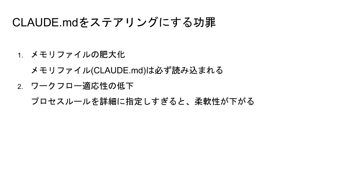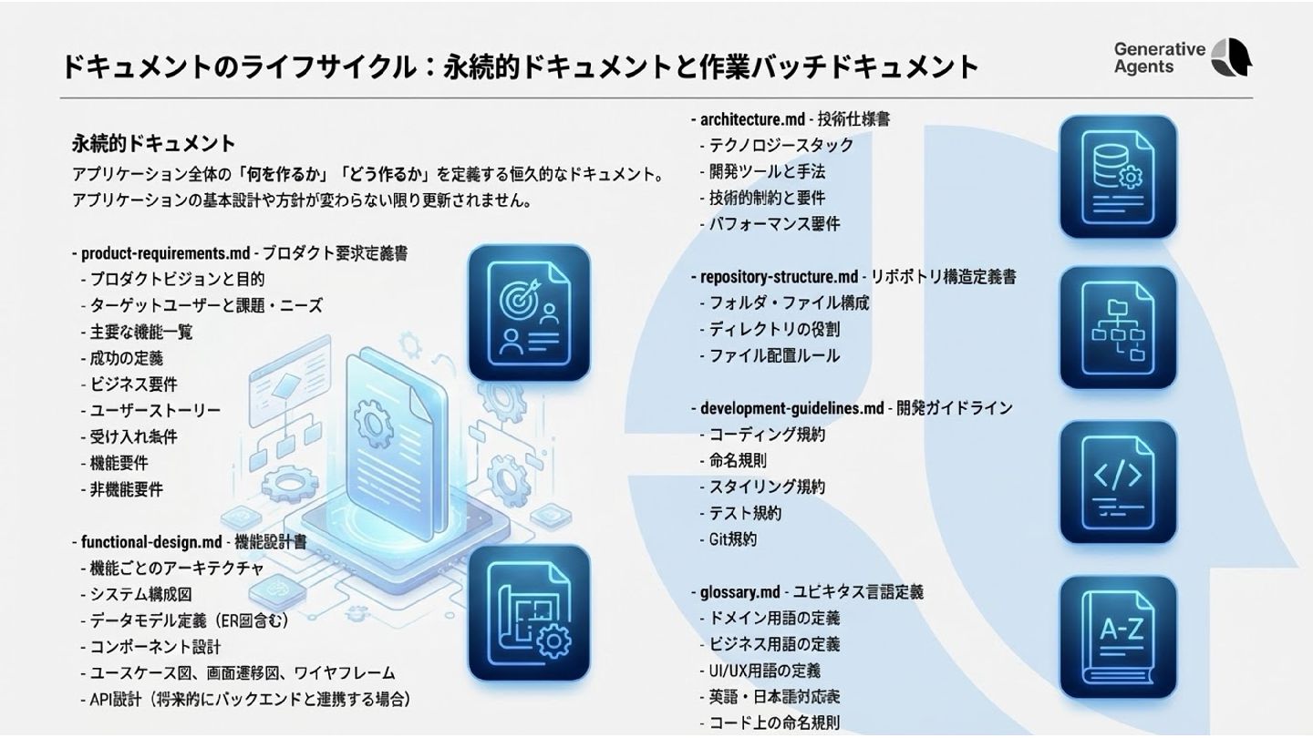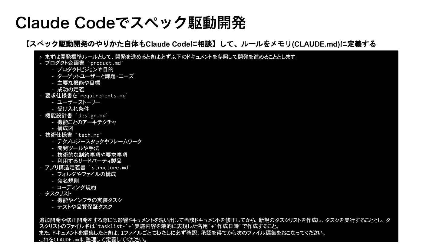 9. $MBVEF$PEFͰεϖοΫۦಈ։ൃ 【スペック駆動開発のやりかた自体もClaude Codeに相談】して、ルールをメモリ(CLAUDE.md)に定義する > まずは開発標準ルールとして、開発を進めるときは必ず以下のドキュメントを参照して開発を進めることとします。 - プロダクト企画書 `product.md` - プロダクトビジョンや目的