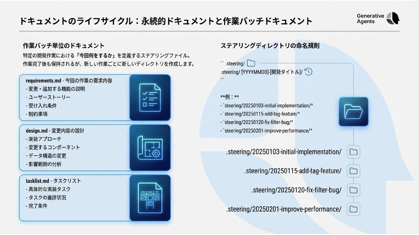 + ルールブック 仕様の管理 .steering/ に作業バッチ単位で保存 aidlc-docs/ にステージ単位で保存 プロセスの駆動 CLAUDE.mdのプロンプトに依存 ルールブックがステージ順序を規定 状態管理 .steering/ 内のタスクリスト aidlc-state.md (専用ファイル) 監査証跡 タスクリストの完了状態 audit.md (全やり取りをタイムスタンプ 付きで記録)