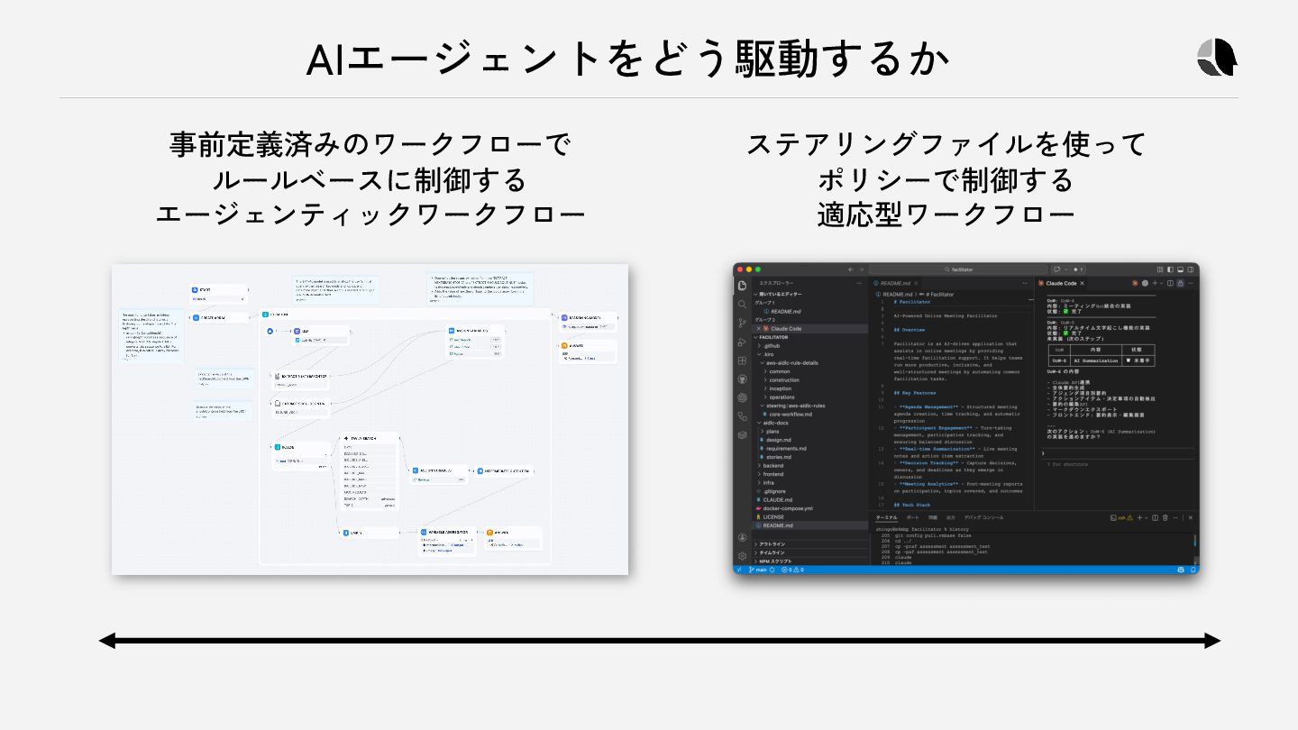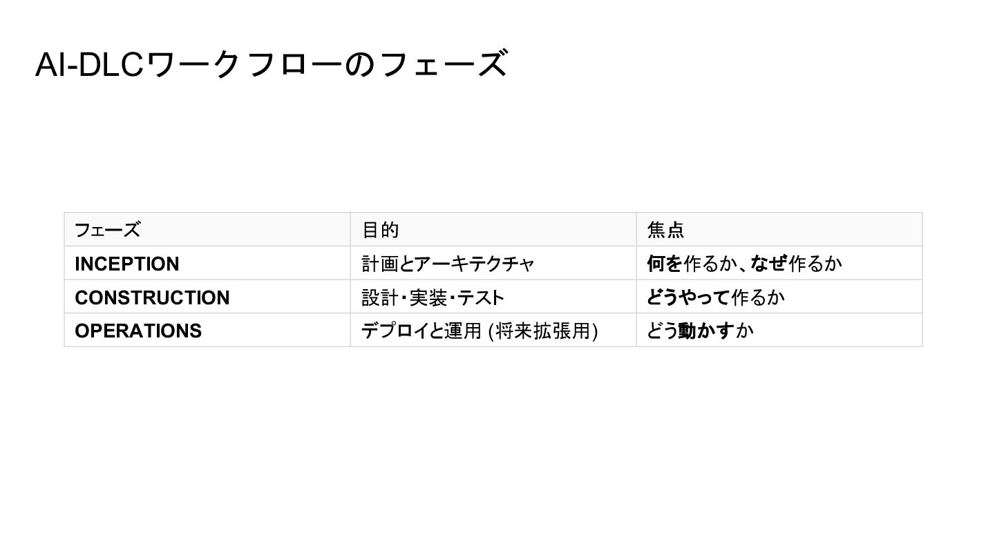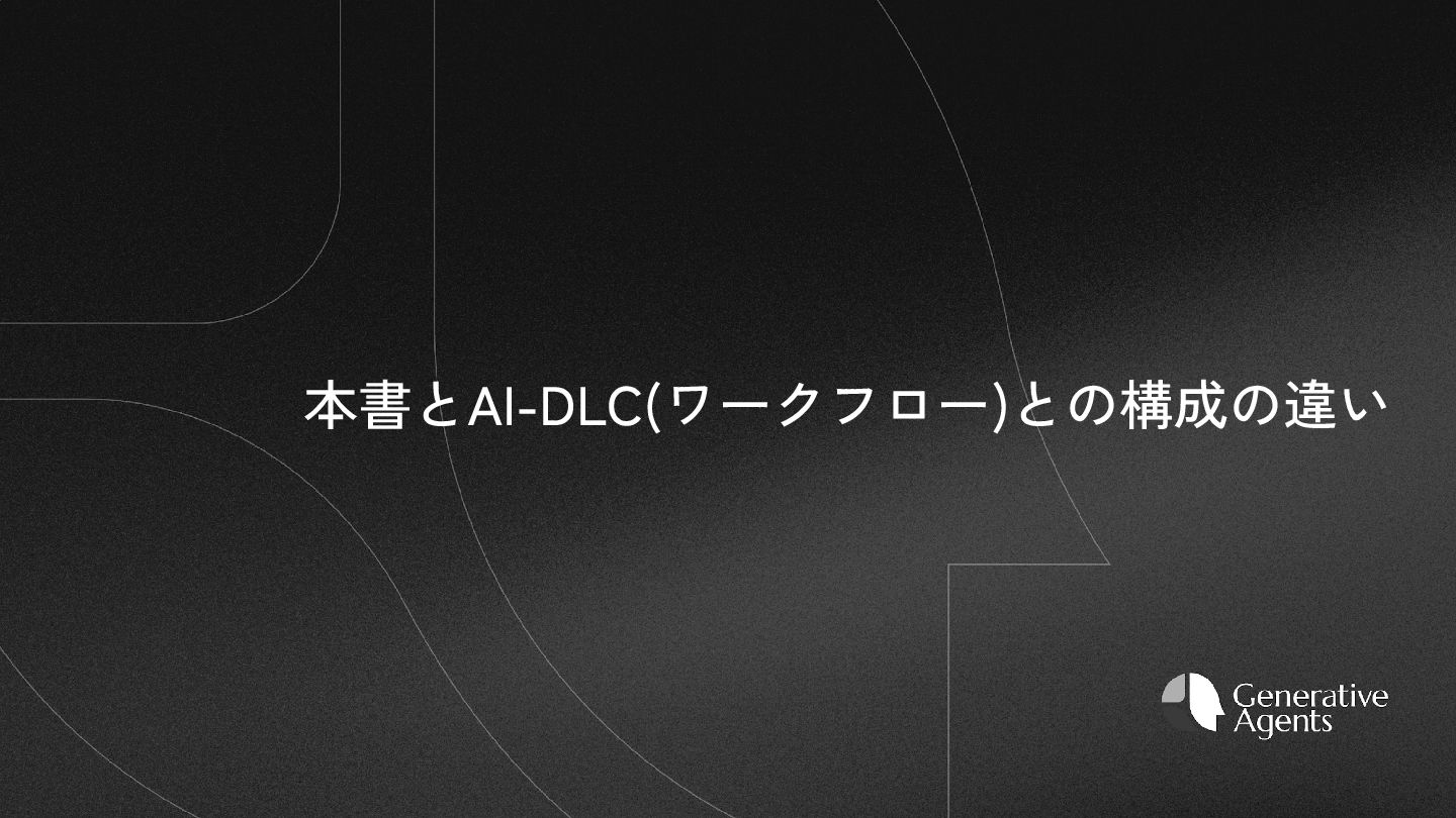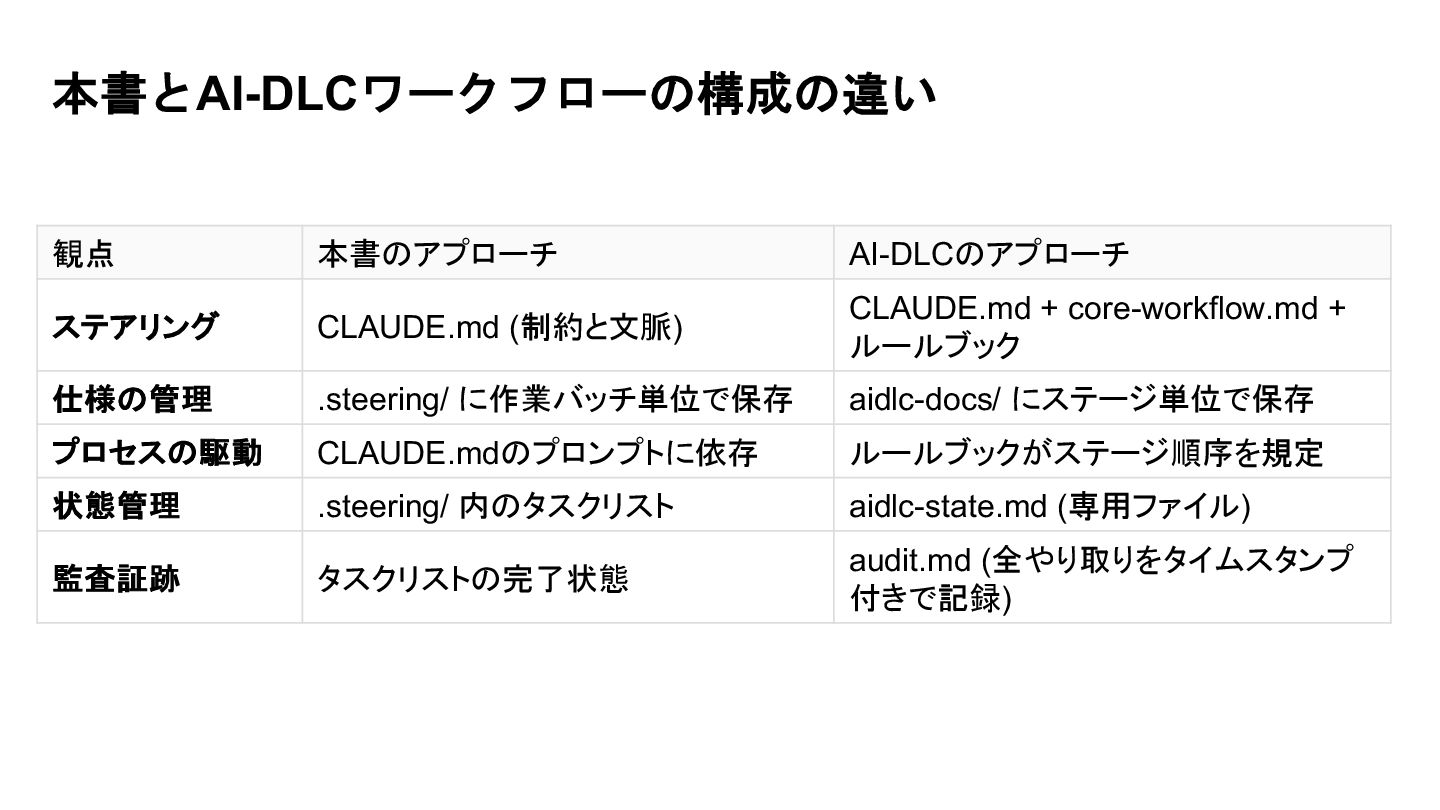 10. 本書とAI-DLCワークフローの構成の違い 観点 本書のアプローチ AI-DLCのアプローチ ステアリング CLAUDE.md (制約と文脈) CLAUDE.md + core-workflow.md