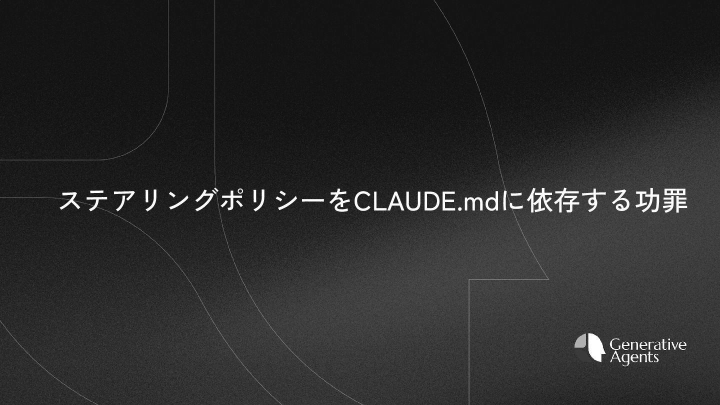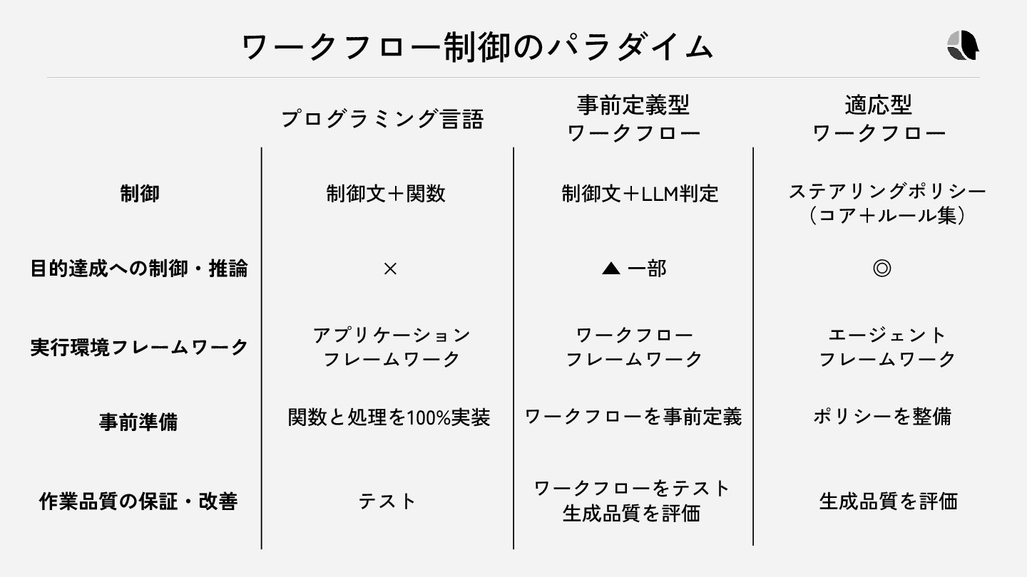 作業品質の保証・改善 制御文+関数 × アプリケーション フレームワーク ワークフロー フレームワーク エージェント フレームワーク 関数と処理を100%実装 ワークフローを事前定義 ポリシーを整備 テスト ワークフローをテスト 生成品質を評価 生成品質を評価 ▲ 一部 ◎ 制御文+LLM判定 ステアリングポリシー (コア+ルール集)
