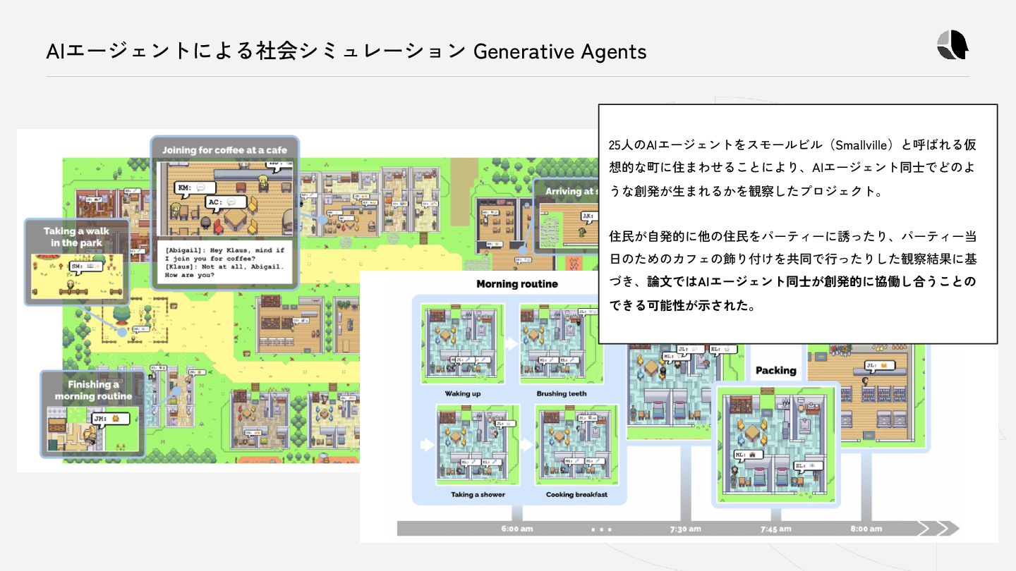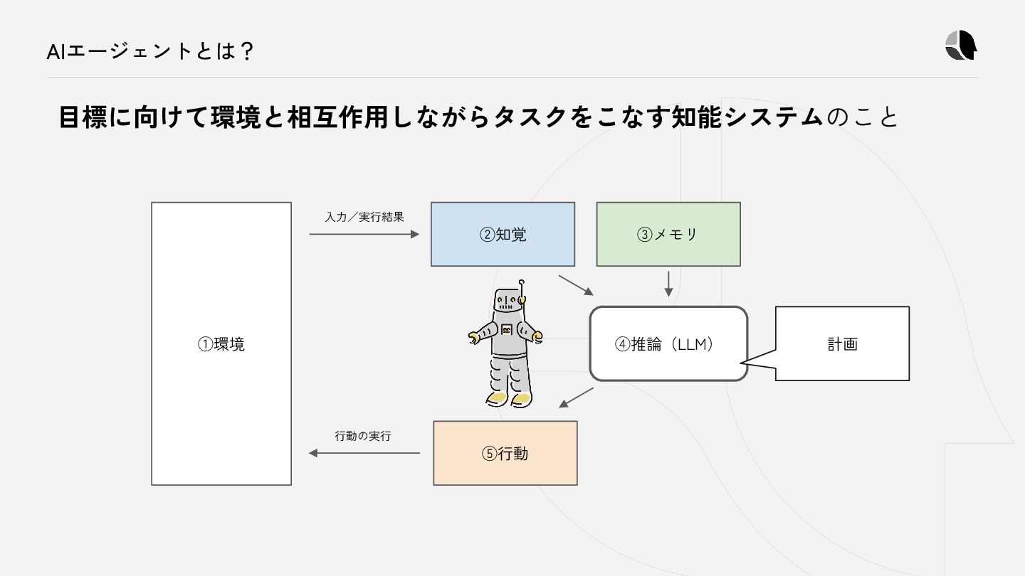 NotebookRead NotebookEdit Task TodoWrite WebFetch WebSearch コンテキスト ファイル操作 Jupyter操作 タスク管理 Web検索 どれにしようかな 推論の結果として、環境に働きかける 具体的な操作のことを「行動」と言います。 例えばコーディングエージェントでは、 全ての行動が「ツール」の実行として扱われます。 ★キーポイント AIエージェントとは、知覚した情報をもとに、これらのツールを選択し続ける (次の行動を推論し続ける)システムと言えます。 ※ 掲載しているツール群は代表的なコーディングエージェントである Claude Codeのものを例示しています。