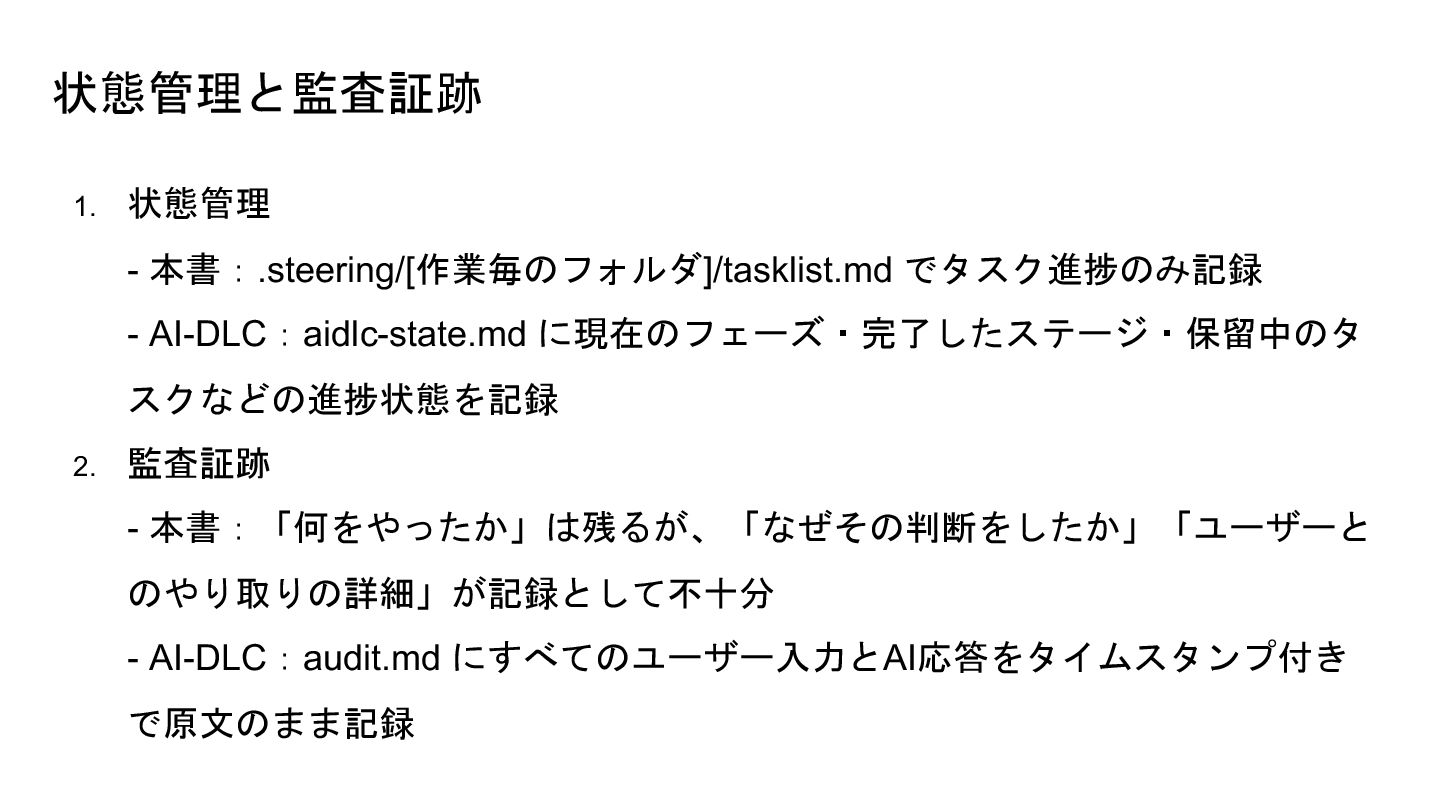 2. 監査証跡 - 本書:「何をやったか」は残るが、「なぜその判断をしたか」「ユーザーと のやり取りの詳細」が記録として不十分 - AI-DLC:audit.md にすべてのユーザー入力とAI応答をタイムスタンプ付き で原文のまま記録
