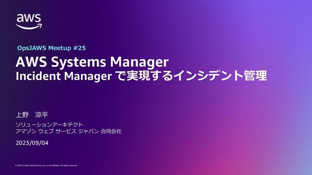rights reserved. © 2023, Amazon Web Services, Inc. or its affiliates. All rights reserved. AWS Systems Manager Incident Manager で実現するインシデント管理 上野 涼平 ソリューションアーキテクト アマゾン ウェブ サービス ジャパン 合同会社 OpsJAWS Meetup #25 2023/09/04