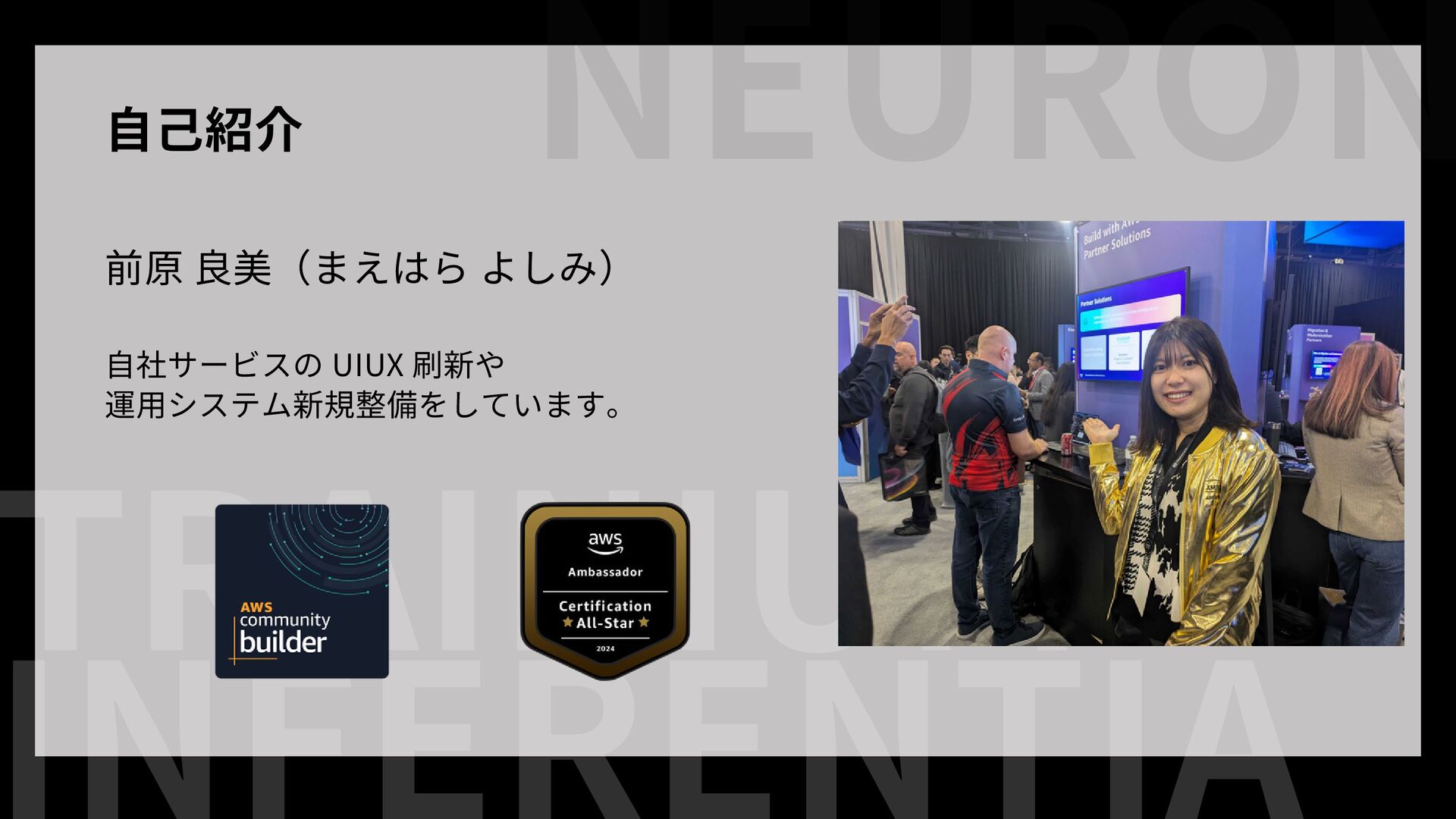 TRAINIUM NEURON 自己紹介 前原 良美(まえはら よしみ) 自社サービスの UIUX 刷新や 運用システム新規整備をしています。