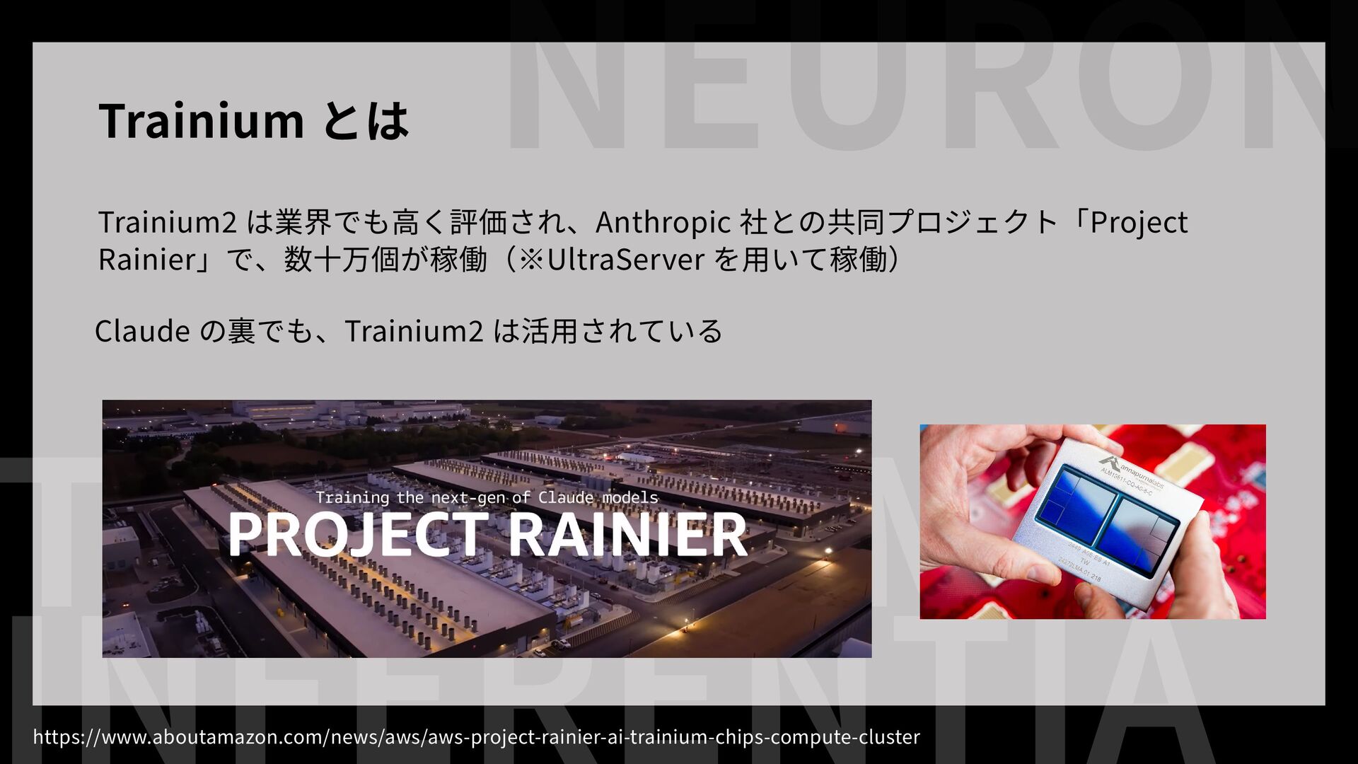 TRAINIUM NEURON Trainium とは Trainium� は業界でも高く評価され、Anthropic 社との共同プロジェクト「Project Rainier」で、数十万個が稼働(※UltraServer を用いて稼働) https://www.aboutamazon.com/news/aws/aws-project-rainier-ai-trainium-chips-compute-cluster