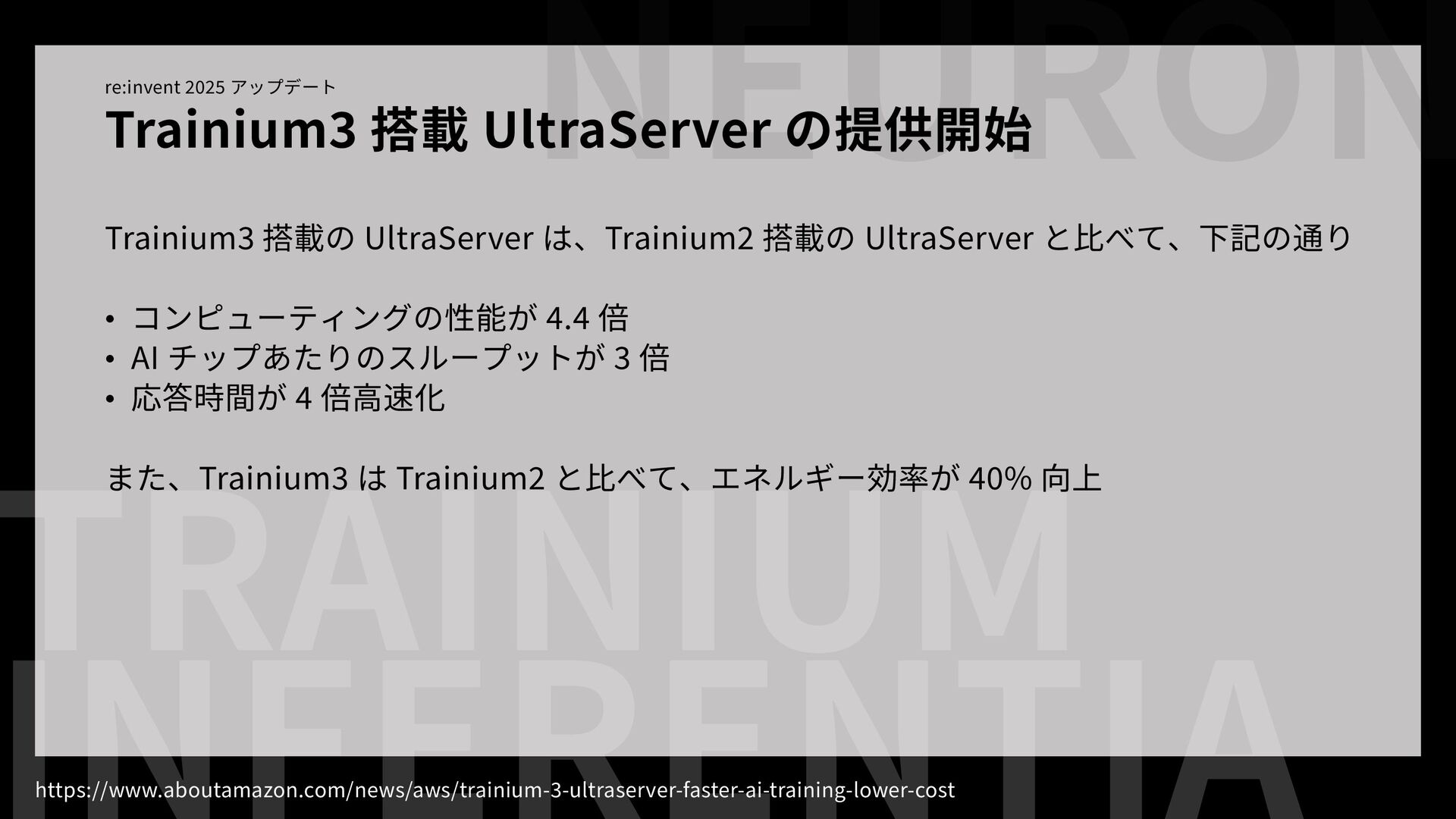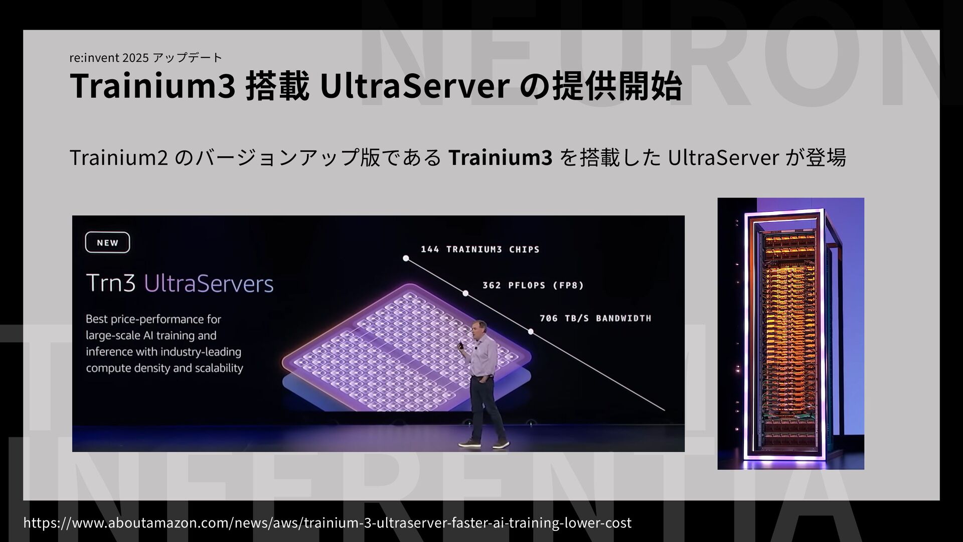 TRAINIUM NEURON Trainium� 搭載 UltraServer の提供開始 re:invent ���� アップデート https://www.aboutamazon.com/news/aws/trainium-�-ultraserver-faster-ai-training-lower-cost