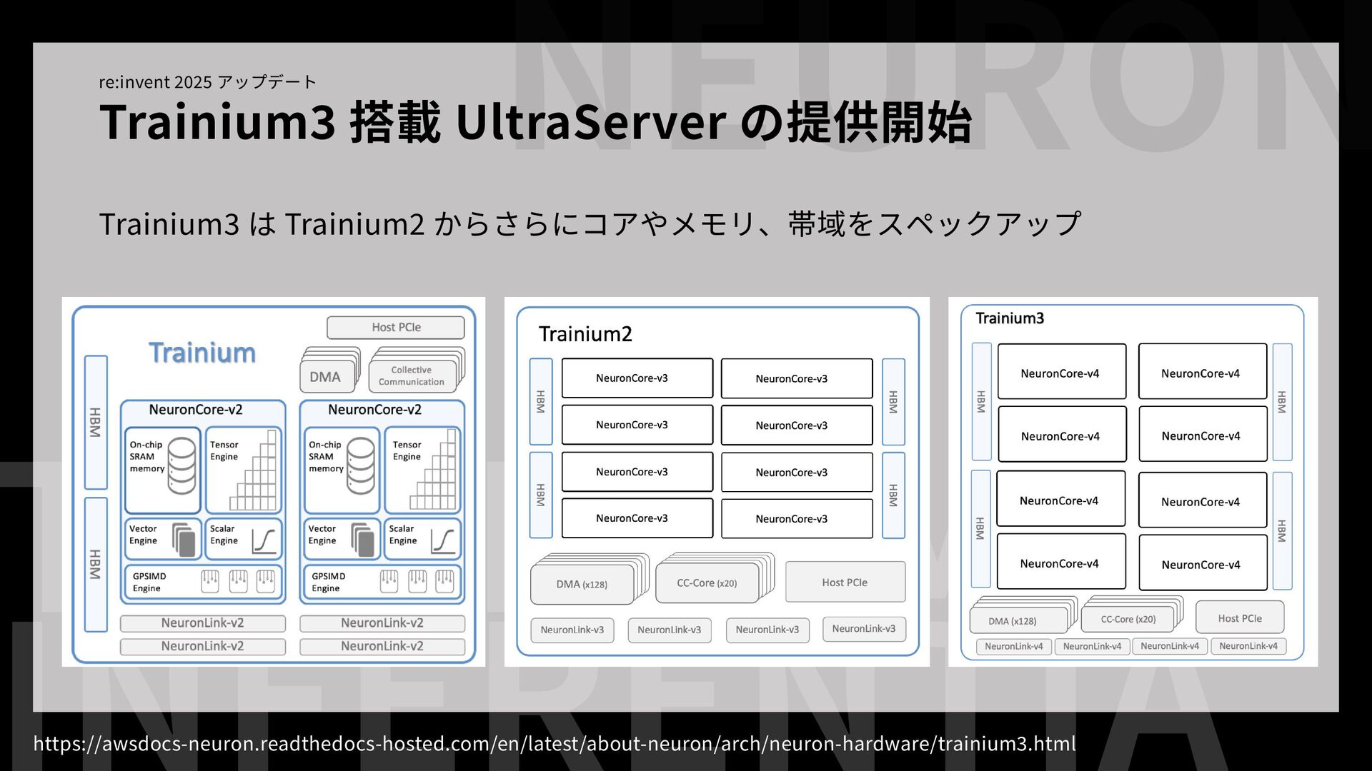 TRAINIUM NEURON Trainium� 搭載 UltraServer の提供開始 re:invent ���� アップデート https://awsdocs-neuron.readthedocs-hosted.com/en/latest/about-neuron/arch/neuron-hardware/trainium�.html