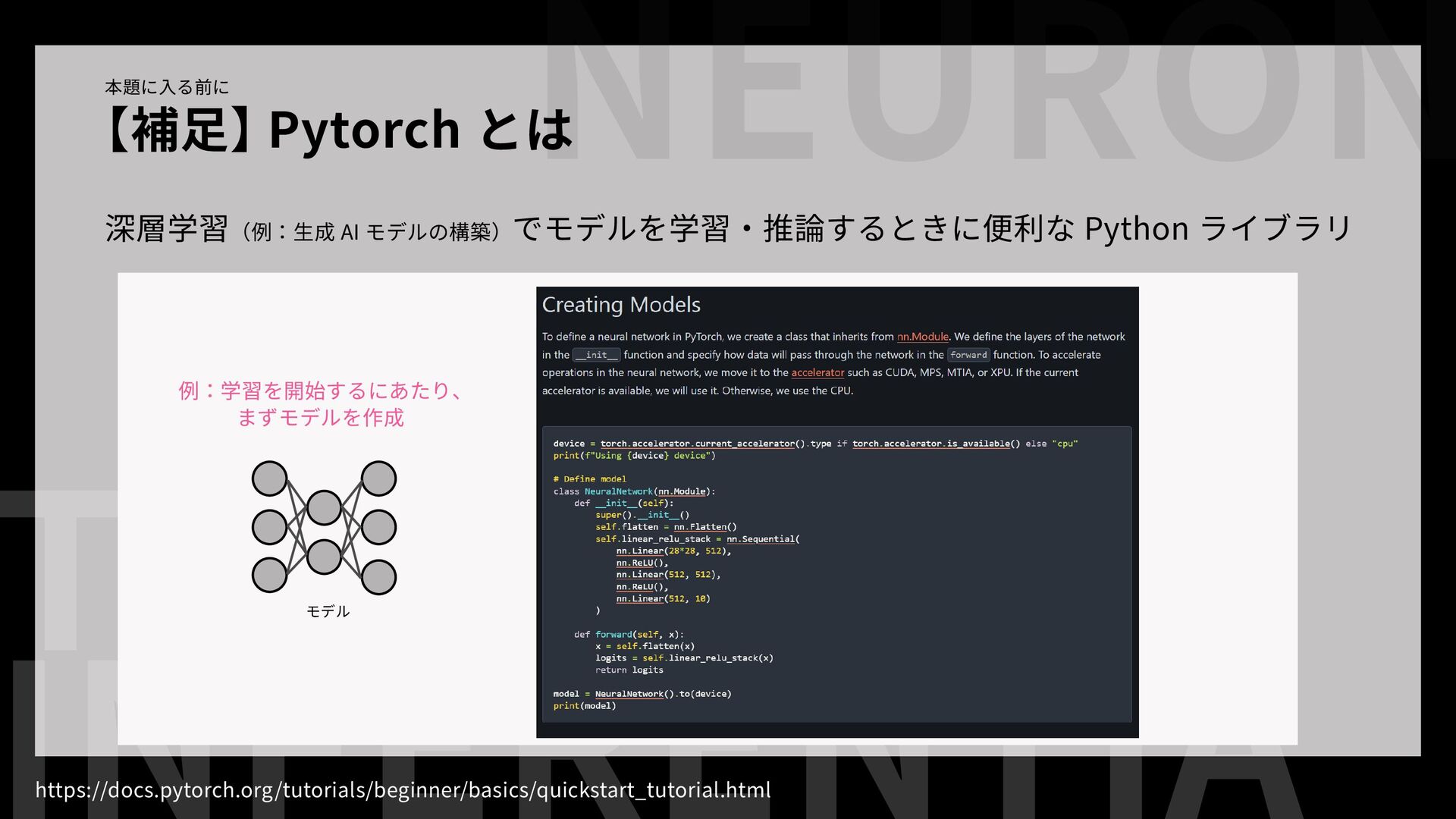 TRAINIUM NEURON 【補足】 Pytorch とは 深層学習(例:生成 AI モデルの構築)でモデルを学習・推論するときに便利な Python ライブラリ
