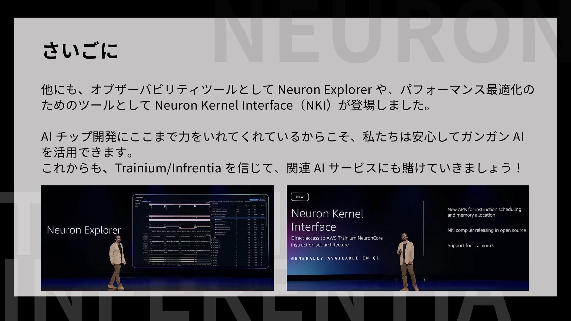 TRAINIUM NEURON さいごに 他にも、オブザーバビリティツールとして Neuron Explorer や、パフォーマンス最適化の ためのツールとして Neuron Kernel
