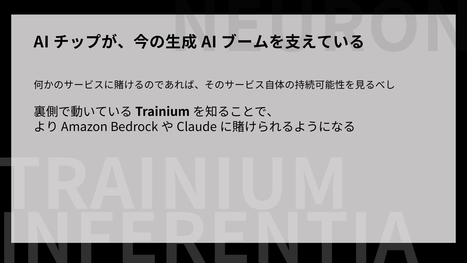 TRAINIUM NEURON AI チップが、今の生成 AI ブームを支えている 何かのサービスに賭けるのであれば、そのサービス自体の持続可能性を見るべし 裏側で動いている Trainium を知ることで、