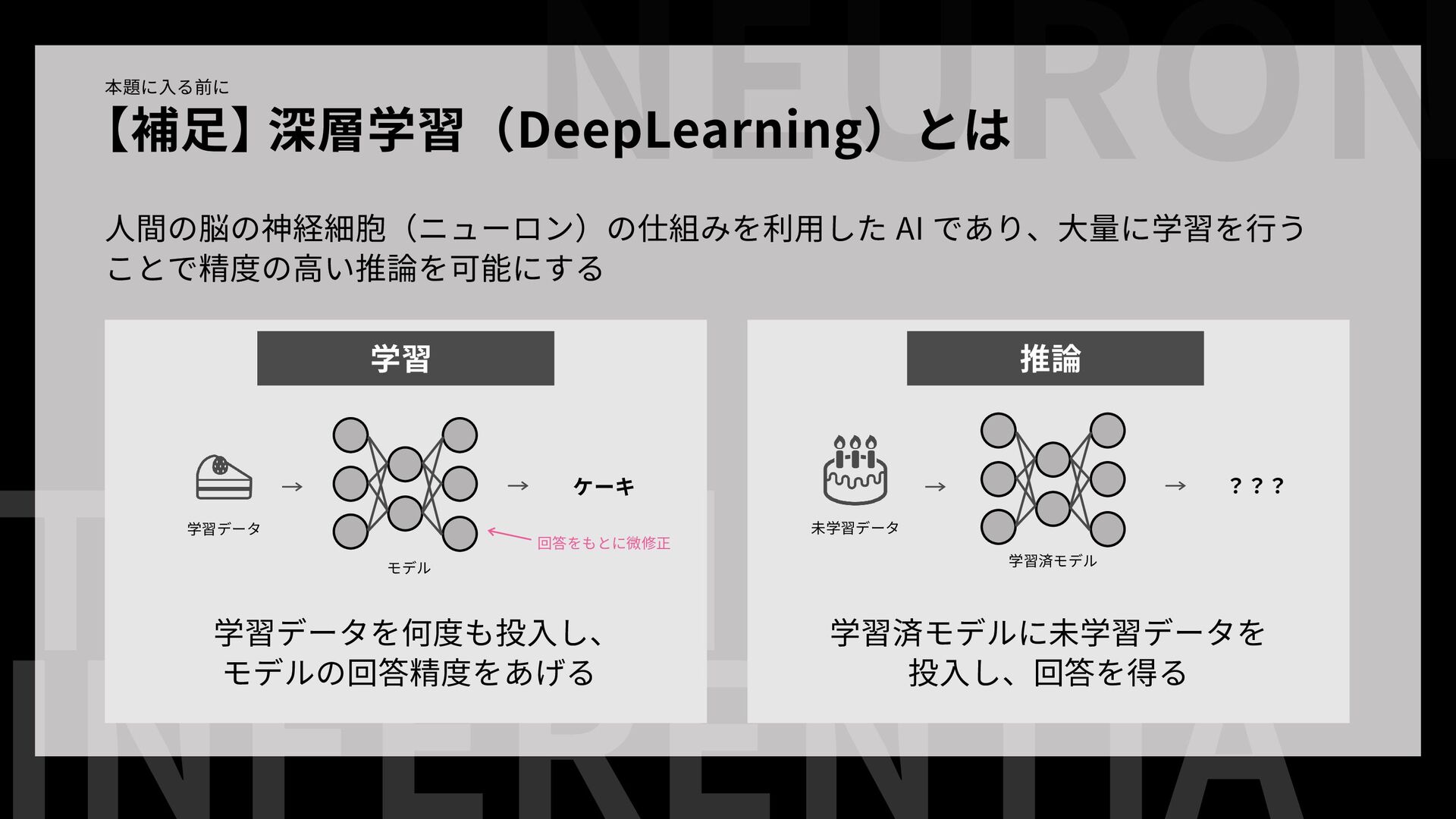 TRAINIUM NEURON 【補足】 深層学習(DeepLearning)とは 人間の脳の神経細胞(ニューロン)の仕組みを利用した AI であり、大量に学習を行う ことで精度の高い推論を可能にする 本題に入る前に 推論