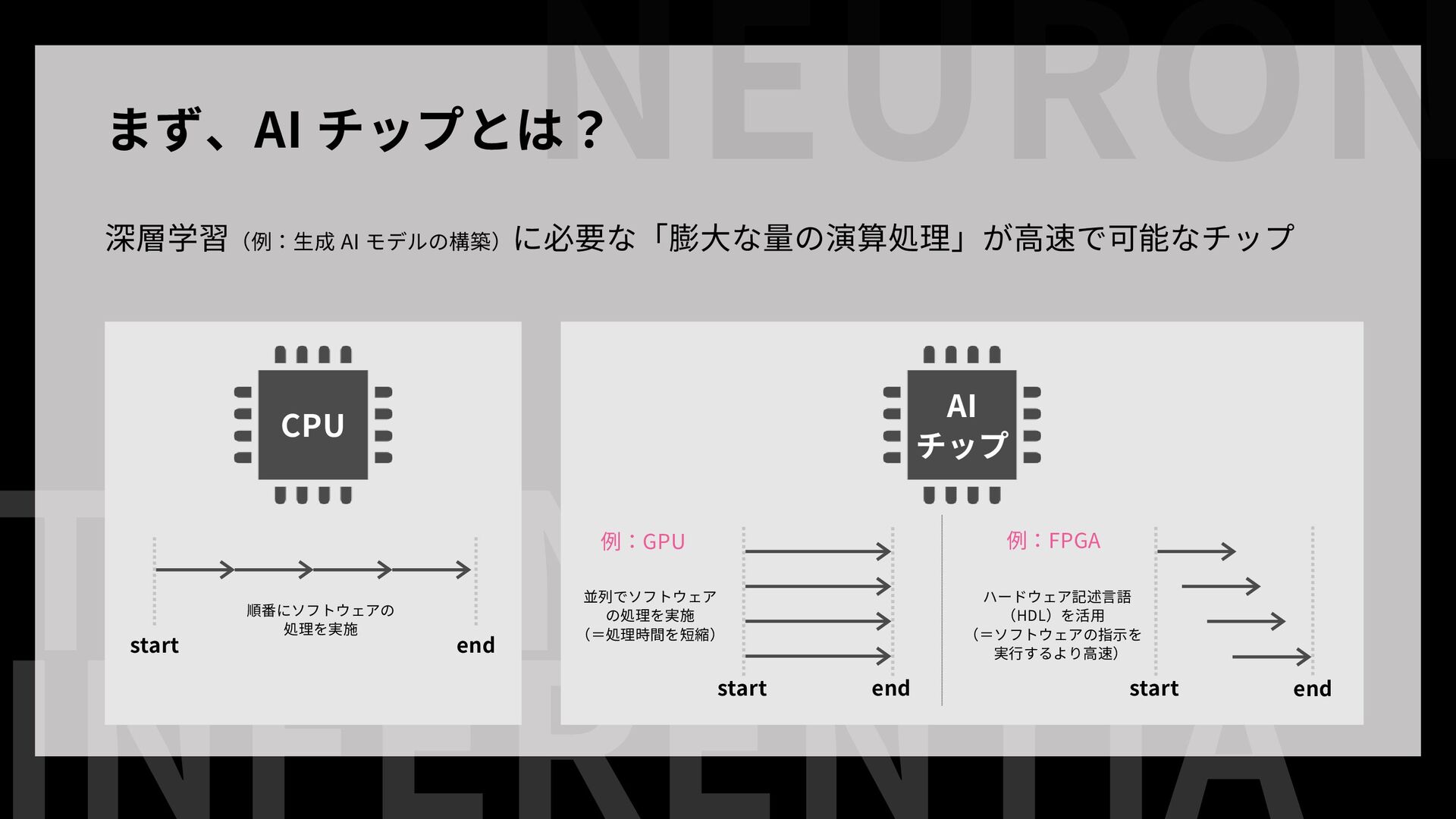 TRAINIUM NEURON まず、AI チップとは? 深層学習(例:生成 AI モデルの構築)に必要な「膨大な量の演算処理」が高速で可能なチップ CPU start end