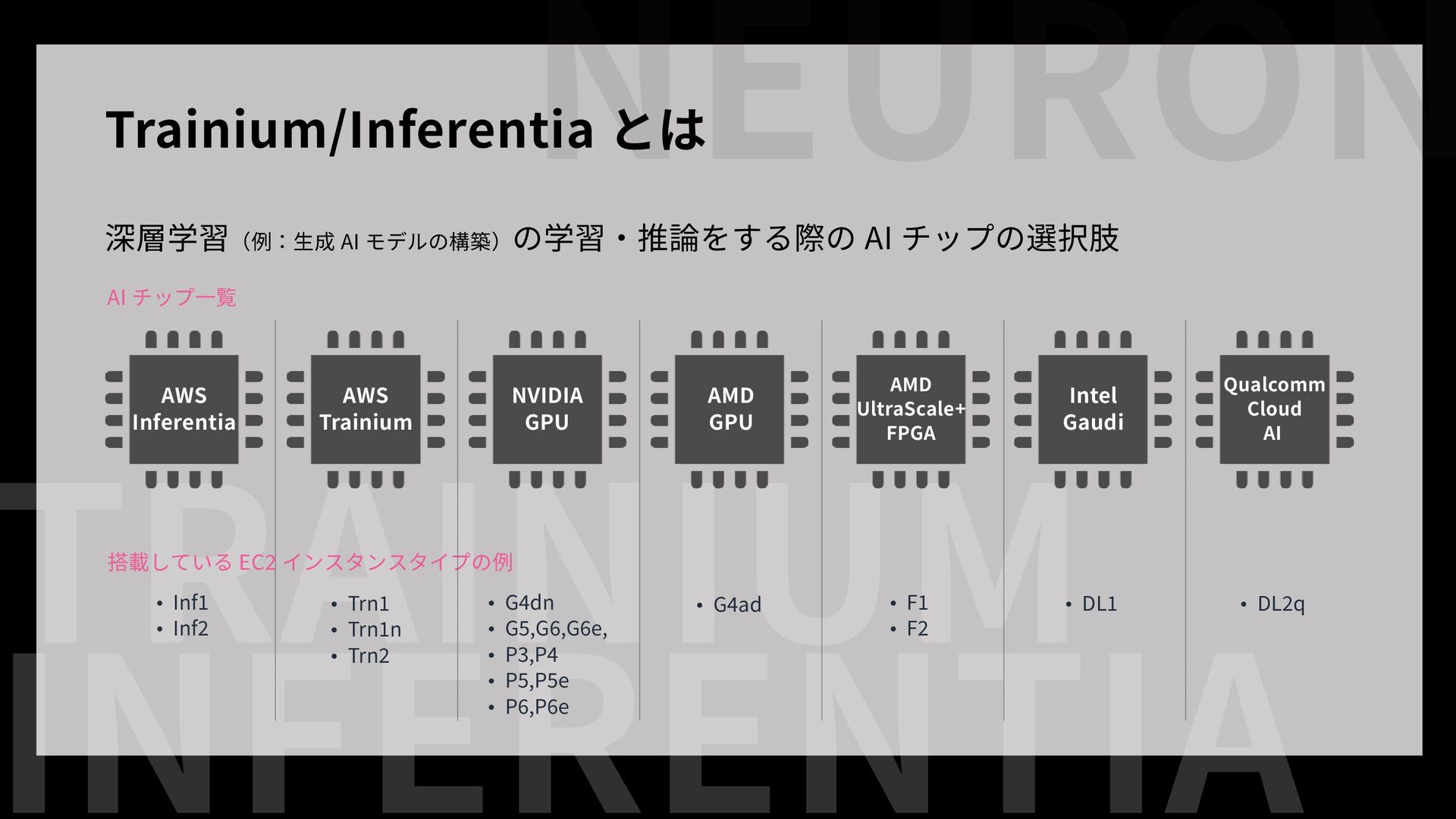 TRAINIUM INFERENTIA NEURON Trainium/Inferentia とは 深層学習(例:生成 AI モデルの構築)の学習・推論をする際の AI チップの選択肢
