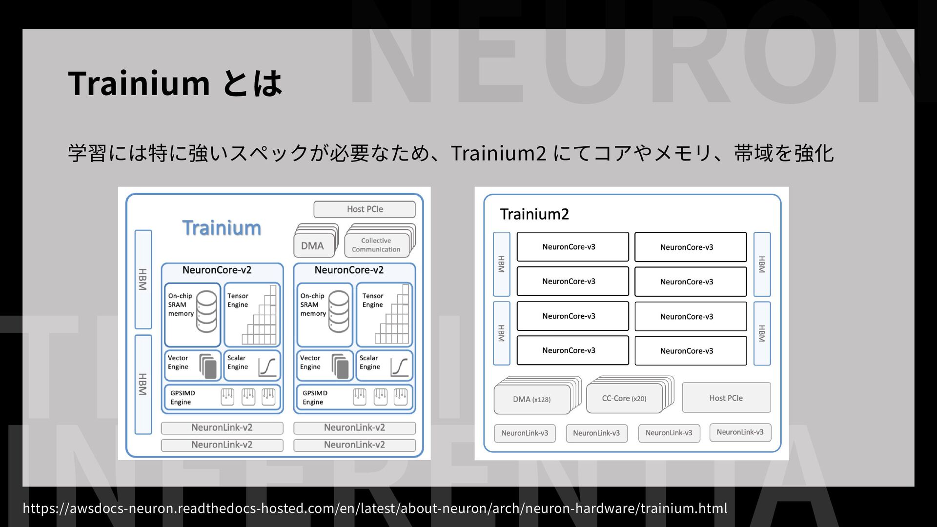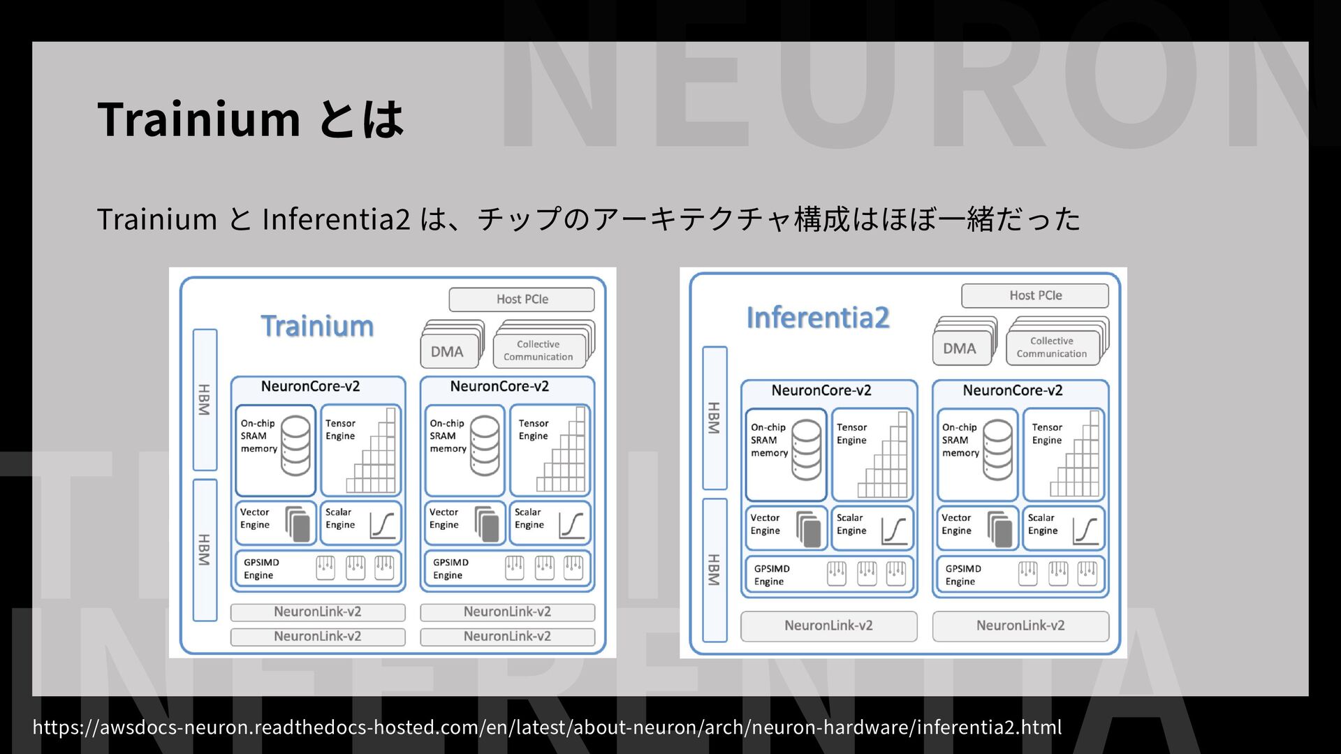 TRAINIUM NEURON Trainium とは Trainium と Inferentia� は、チップのアーキテクチャ構成はほぼ一緒だった https://awsdocs-neuron.readthedocs-hosted.com/en/latest/about-neuron/arch/neuron-hardware/inferentia�.html