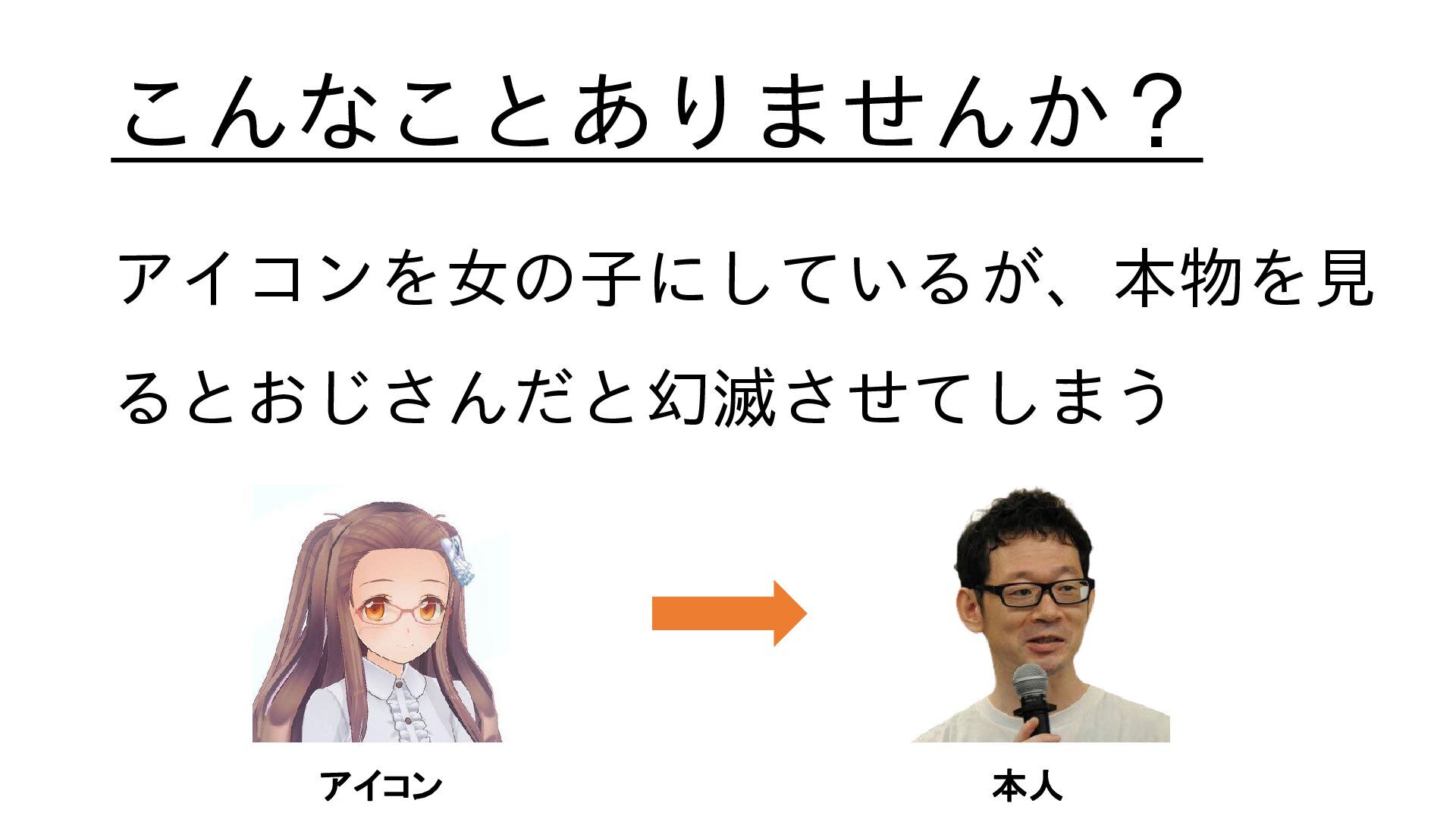 こんなことありませんか? アイコンを女の子にしているが、本物を見 るとおじさんだと幻滅させてしまう アイコン 本人