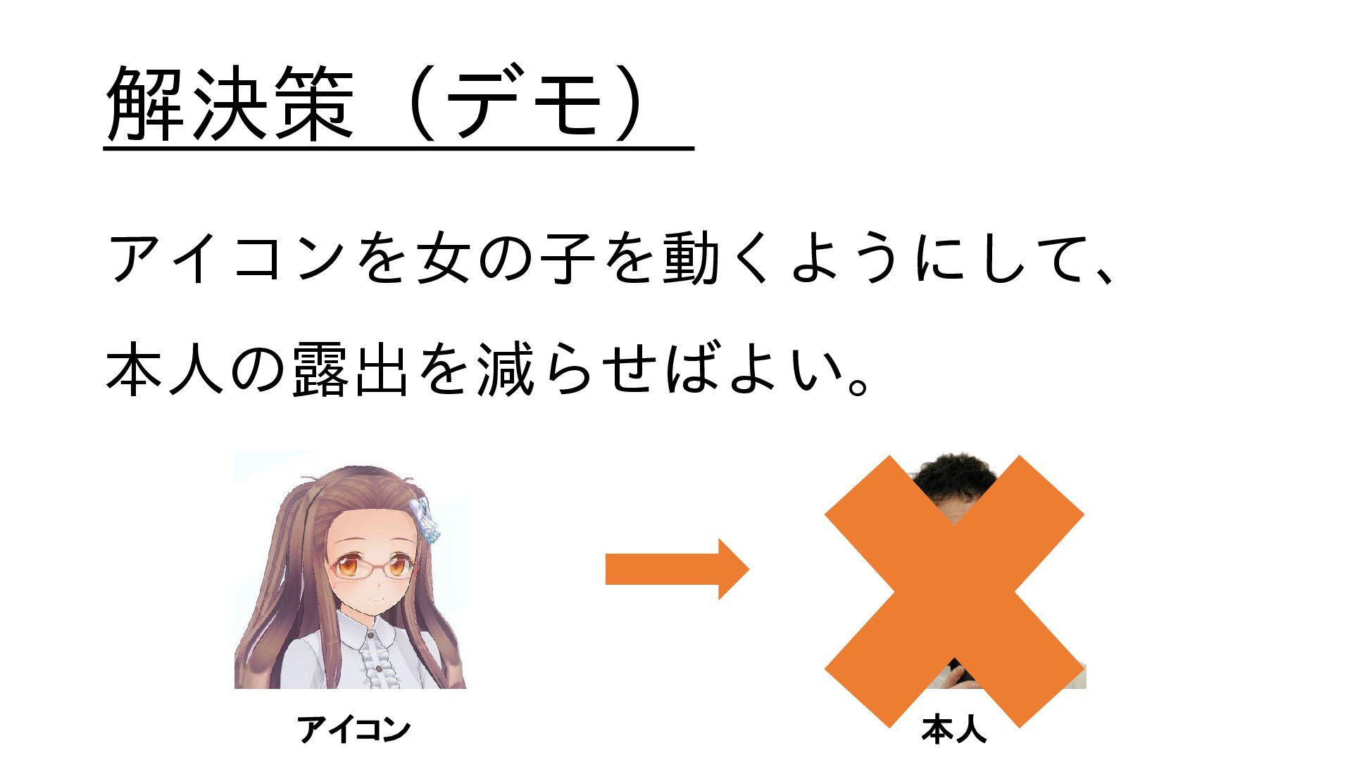 解決策(デモ) アイコンを女の子を動くようにして、 本人の露出を減らせばよい。 アイコン 本人