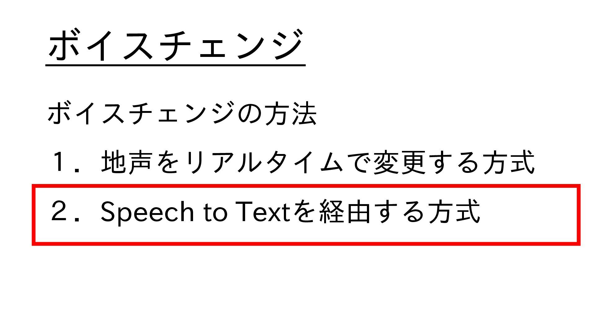 ボイスチェンジ ボイスチェンジの方法 1.地声をリアルタイムで変更する方式 2.Speech to Textを経由する方式