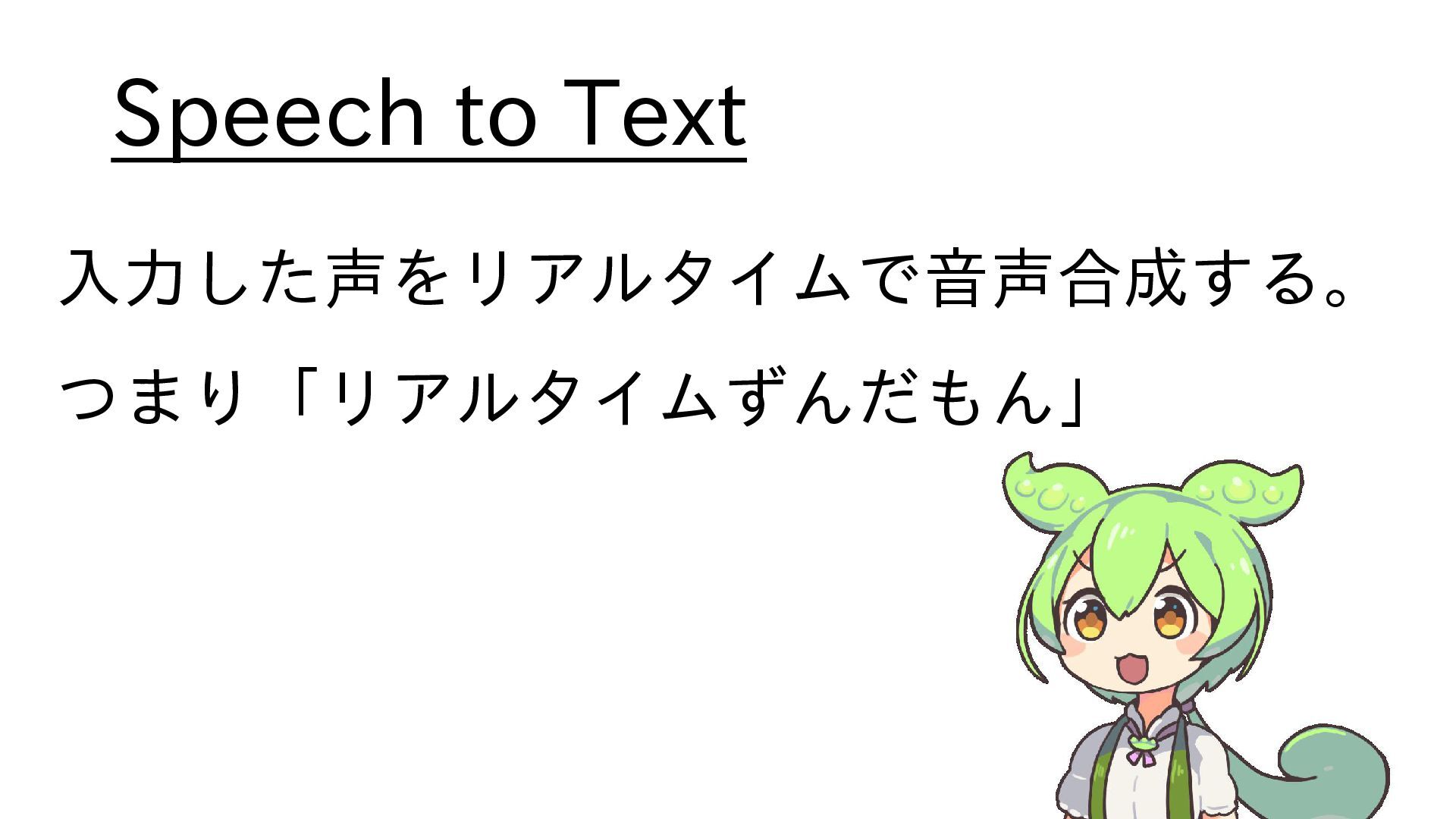Speech to Text 入力した声をリアルタイムで音声合成する。 つまり「リアルタイムずんだもん」