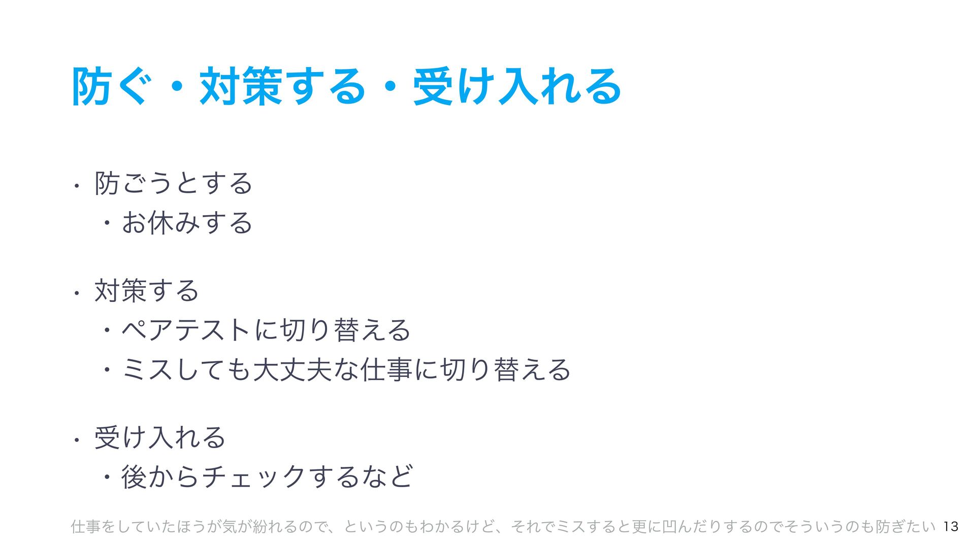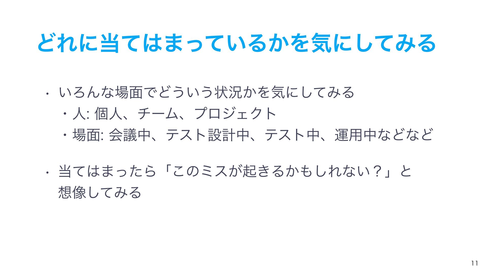 ͲΕʹͯ·͍ͬͯΔ͔Λؾʹͯ͠ΈΔ w ͍ΖΜͳ໘ͰͲ͏͍͏ঢ়گ͔Λؾʹͯ͠ΈΔ ɾਓݸਓɺνʔϜɺϓϩδΣΫτ ɾ໘ձٞதɺςετઃܭதɺςετதɺӡ༻தͳͲͳͲ w ͯ·ͬͨΒʮ͜ͷϛε͕ى͖Δ͔͠Εͳ͍ʁʯͱ ૾ͯ͠ΈΔ