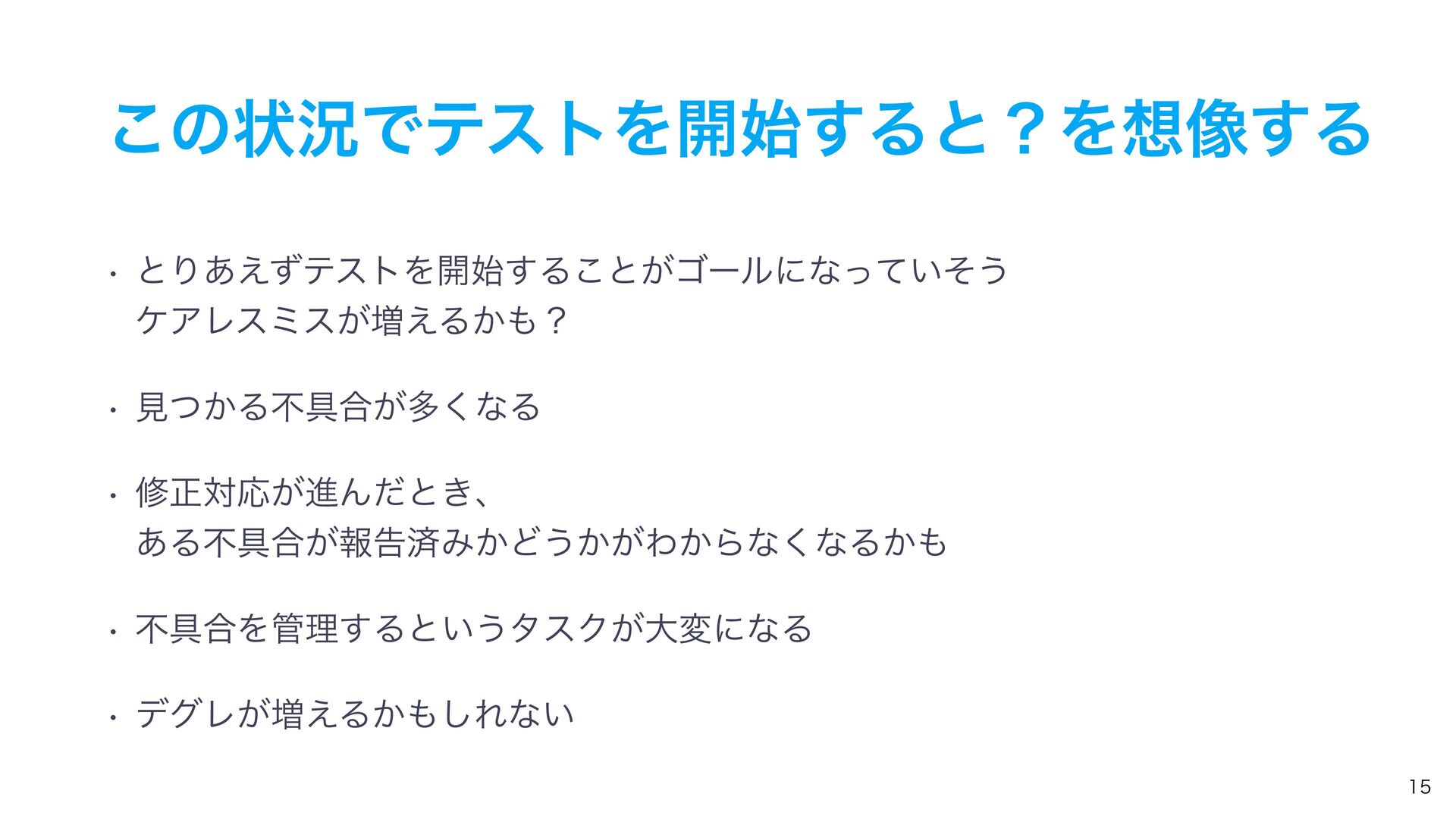 ͜ͷঢ়گͰςετΛ։࢝͢ΔͱʁΛ૾͢Δ w ͱΓ͋͑ͣςετΛ։࢝͢Δ͜ͱ͕ΰʔϧʹͳ͍ͬͯͦ͏ έΞϨεϛε͕૿͑Δ͔ʁ w ݟ͔ͭΔෆ۩߹͕ଟ͘ͳΔ w मਖ਼ରԠ͕ਐΜͩͱ͖ɺ ͋Δෆ۩߹͕ใࠂࡁΈ͔Ͳ͏͔͕Θ͔Βͳ͘ͳΔ͔ w