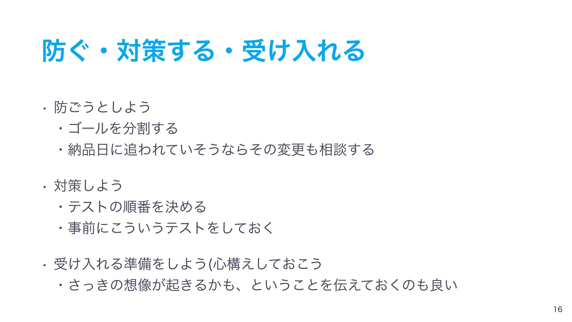 ͙ɾରࡦ͢Δɾड͚ೖΕΔ w ͝͏ͱ͠Α͏ ɾΰʔϧΛׂ͢Δ ɾೲʹΘΕ͍ͯͦ͏ͳΒͦͷมߋ૬ஊ͢Δ w ରࡦ͠Α͏ ɾςετͷॱ൪ΛܾΊΔ ɾࣄલʹ͜͏͍͏ςετΛ͓ͯ͘͠ w