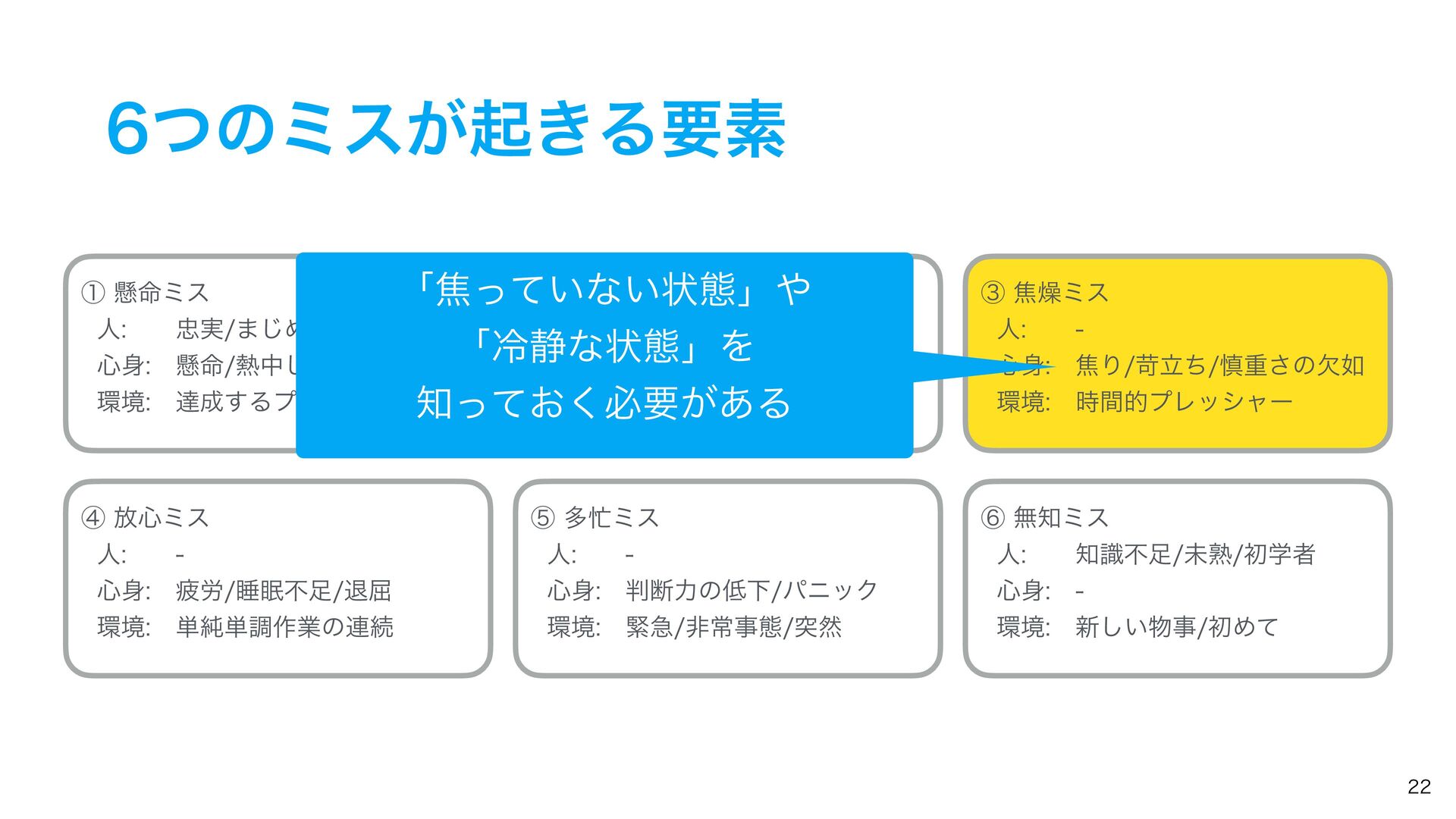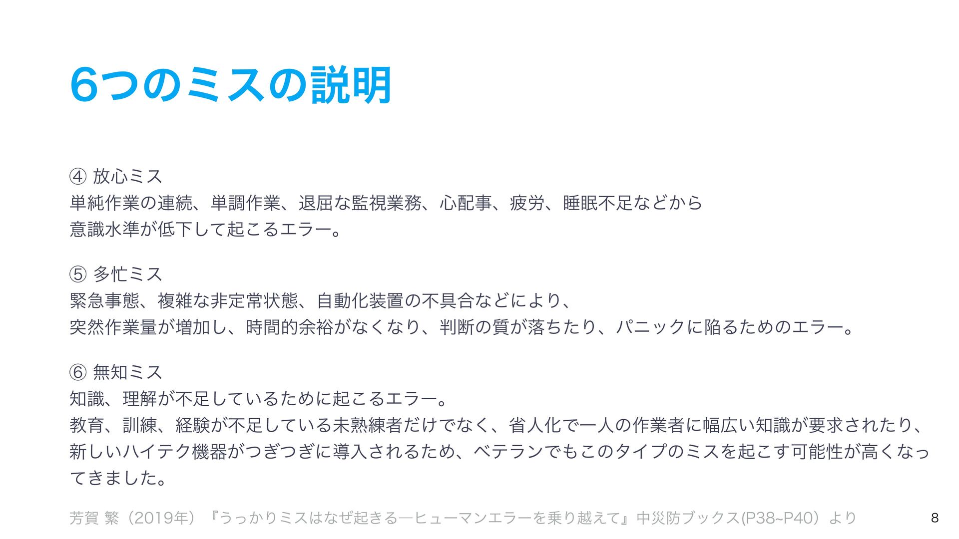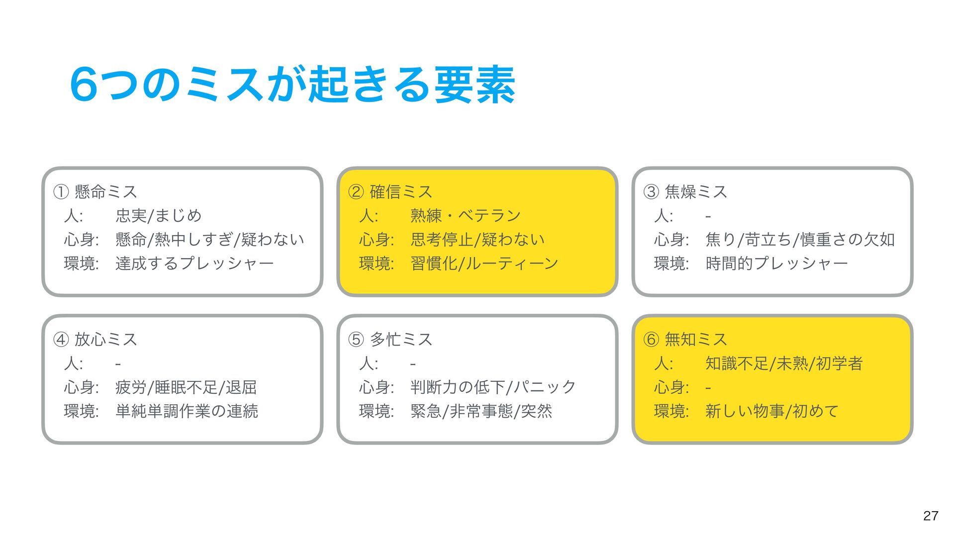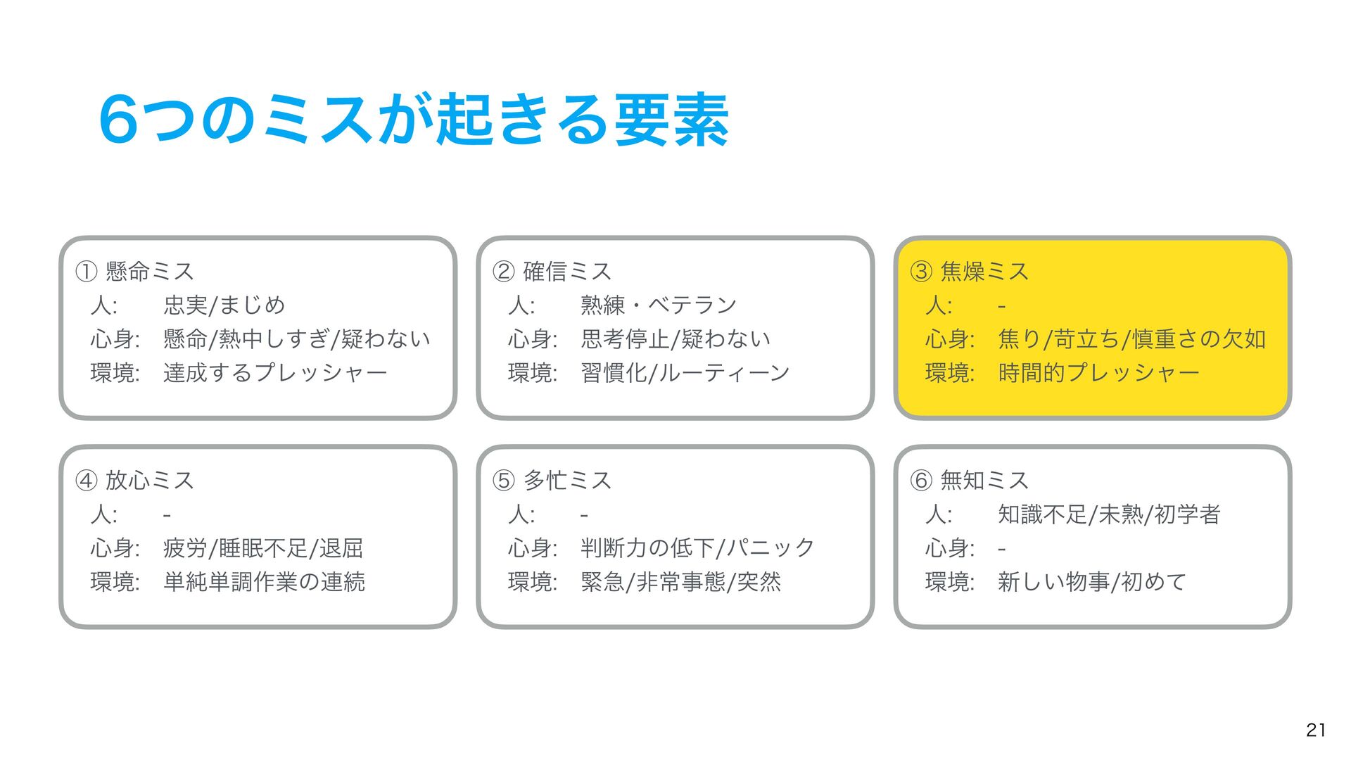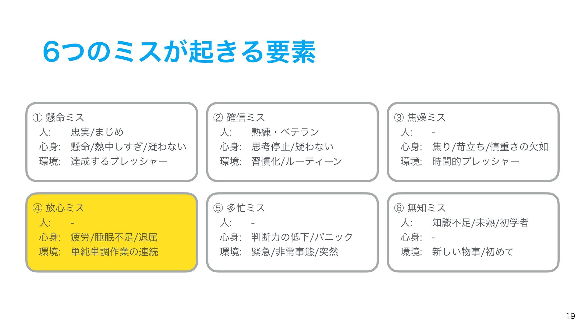ͭͷϛεͷઆ໌ ᶆ์৺ϛε ୯७࡞ۀͷ࿈ଓɺ୯ௐ࡞ۀɺୀ۶ͳࢹۀɺ৺ࣄɺർ࿑ɺਭෆͳͲ͔Β ҙࣝਫ४͕Լͯ͠ى͜ΔΤϥʔɻ ᶇଟϛε ۓٸࣄଶɺෳࡶͳඇఆৗঢ়ଶɺࣗಈԽஔͷෆ۩߹ͳͲʹΑΓɺ ಥવ࡞ۀྔ͕૿Ճ͠ɺ࣌ؒత༨༟͕ͳ͘ͳΓɺஅͷ࣭͕མͪͨΓɺύχοΫʹؕΔͨΊͷΤϥʔɻ ᶈແϛε ࣝɺཧղ͕ෆ͍ͯ͠ΔͨΊʹى͜ΔΤϥʔɻ ڭҭɺ܇࿅ɺܦݧ͕ෆ͍ͯ͠Δະख़࿅ऀ͚ͩͰͳ͘ɺলਓԽͰҰਓͷ࡞ۀऀʹ෯͍͕ࣝཁٻ͞ΕͨΓɺ