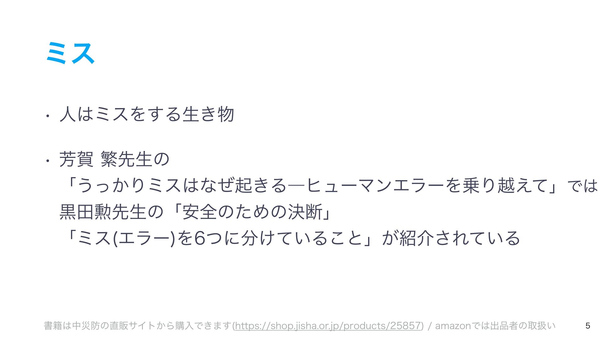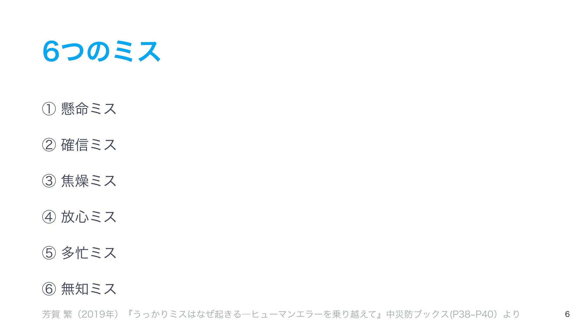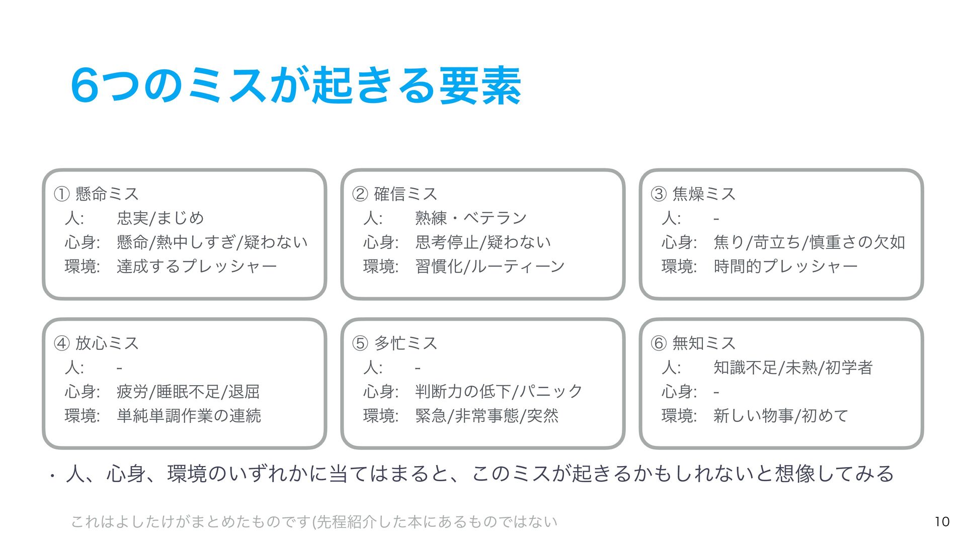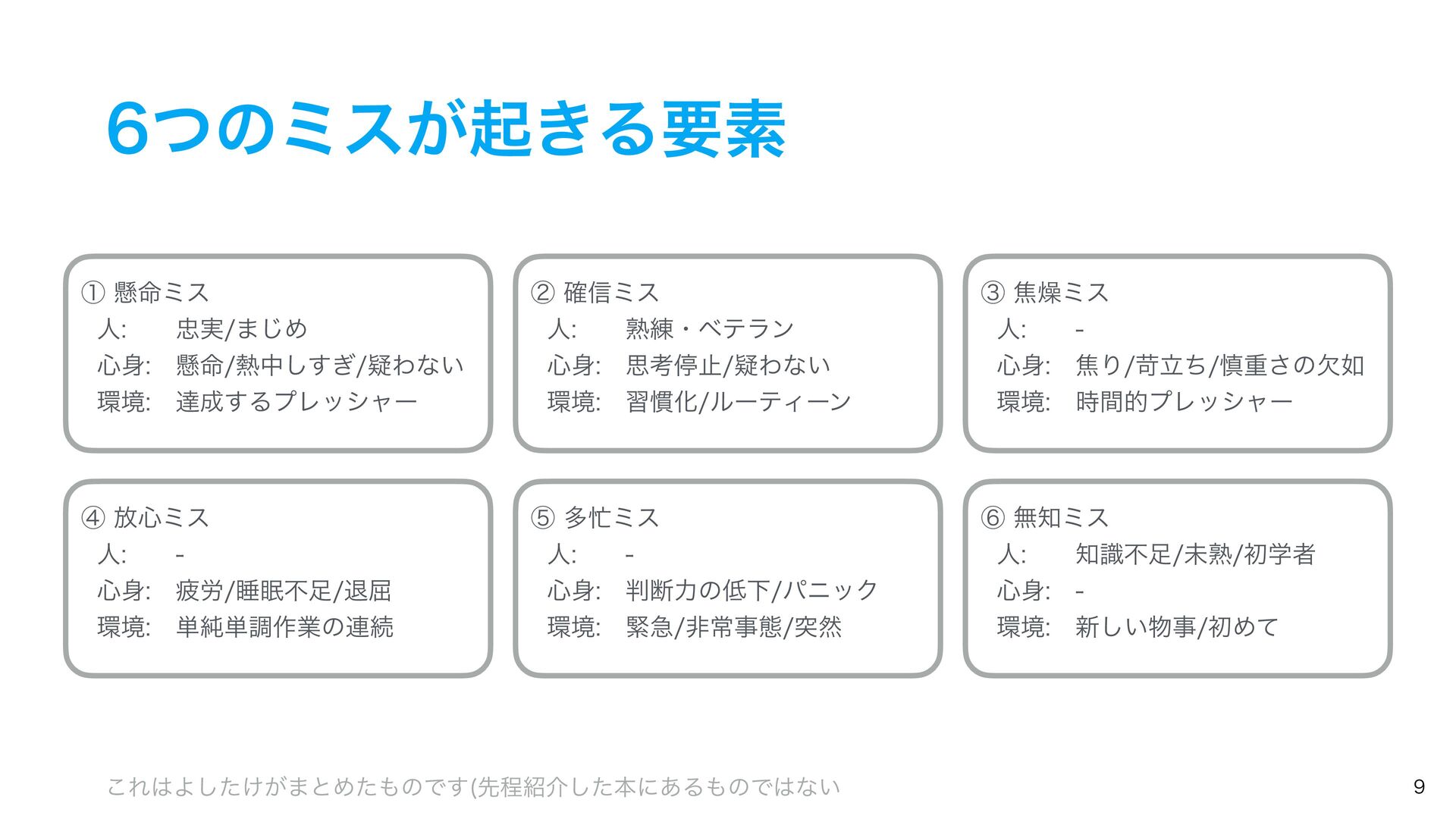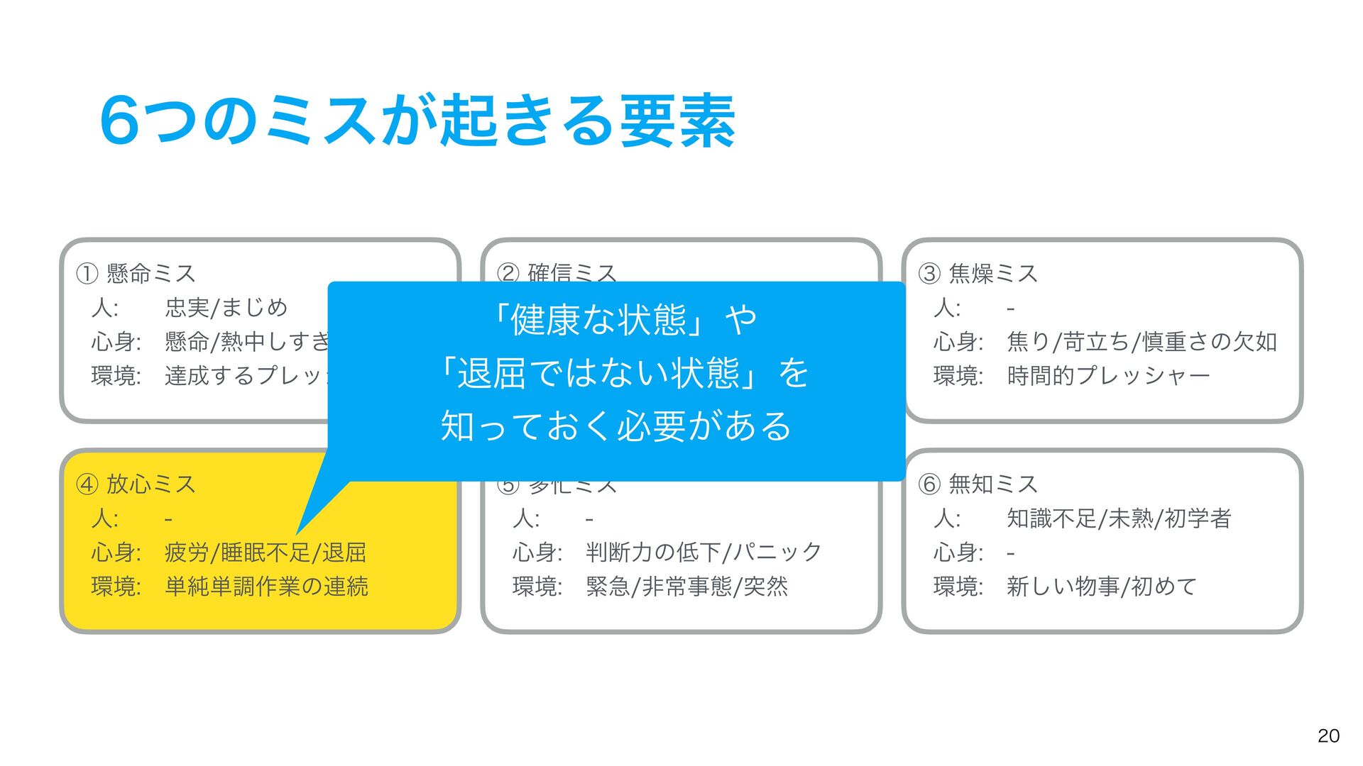 ͭͷϛεͷઆ໌ ᶆ์৺ϛε ୯७࡞ۀͷ࿈ଓɺ୯ௐ࡞ۀɺୀ۶ͳࢹۀɺ৺ࣄɺർ࿑ɺਭෆͳͲ͔Β ҙࣝਫ४͕Լͯ͠ى͜ΔΤϥʔɻ ᶇଟϛε ۓٸࣄଶɺෳࡶͳඇఆৗঢ়ଶɺࣗಈԽஔͷෆ۩߹ͳͲʹΑΓɺ ಥવ࡞ۀྔ͕૿Ճ͠ɺ࣌ؒత༨༟͕ͳ͘ͳΓɺஅͷ࣭͕མͪͨΓɺύχοΫʹؕΔͨΊͷΤϥʔɻ ᶈແϛε ࣝɺཧղ͕ෆ͍ͯ͠ΔͨΊʹى͜ΔΤϥʔɻ ڭҭɺ܇࿅ɺܦݧ͕ෆ͍ͯ͠Δະख़࿅ऀ͚ͩͰͳ͘ɺলਓԽͰҰਓͷ࡞ۀऀʹ෯͍͕ࣝཁٻ͞ΕͨΓɺ