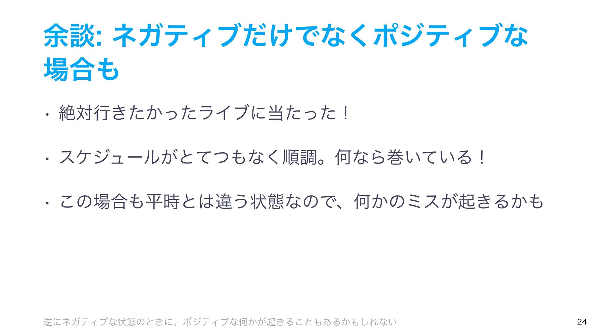 ༨ஊωΨςΟϒ͚ͩͰͳ͘ϙδςΟϒͳ ߹ w ઈରߦ͖͔ͨͬͨϥΠϒʹͨͬͨʂ w εέδϡʔϧ͕ͱͯͭͳ͘ॱௐɻԿͳΒר͍͍ͯΔʂ w ͜ͷ߹ฏ࣌ͱҧ͏ঢ়ଶͳͷͰɺԿ͔ͷϛε͕ى͖Δ͔ ٯʹωΨςΟϒͳঢ়ଶͷͱ͖ʹɺϙδςΟϒͳԿ͔͕ى͖Δ͜ͱ͋Δ͔͠Εͳ͍