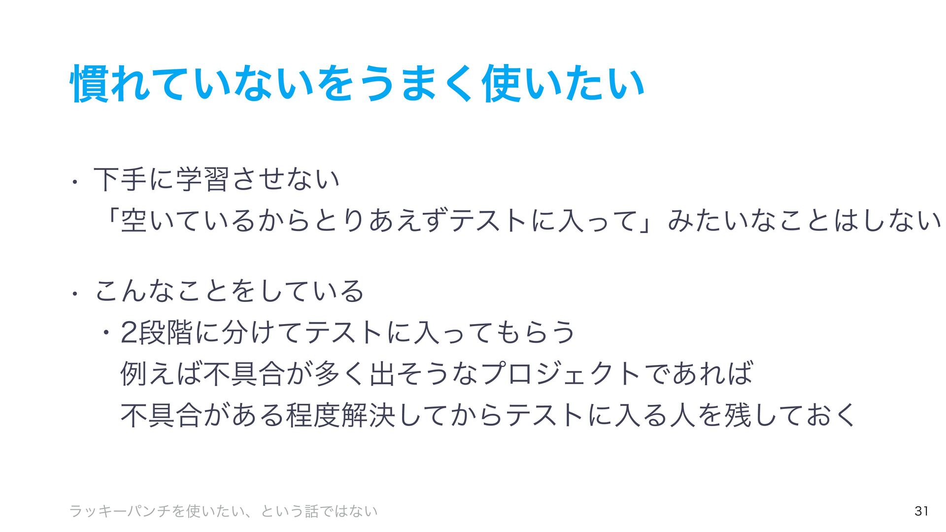 ׳Ε͍ͯͳ͍Λ͏·͍͍ͨ͘ w Լखʹֶशͤ͞ͳ͍ ʮۭ͍͍ͯΔ͔ΒͱΓ͋͑ͣςετʹೖͬͯʯΈ͍ͨͳ͜ͱ͠ͳ͍ w ͜Μͳ͜ͱΛ͍ͯ͠Δ ɾஈ֊ʹ͚ͯςετʹೖͬͯΒ͏ ɹྫ͑ෆ۩߹͕ଟ͘ग़ͦ͏ͳϓϩδΣΫτͰ͋Ε ɹෆ۩߹͕͋Δఔղܾ͔ͯ͠ΒςετʹೖΔਓΛ͓ͯ͘͠