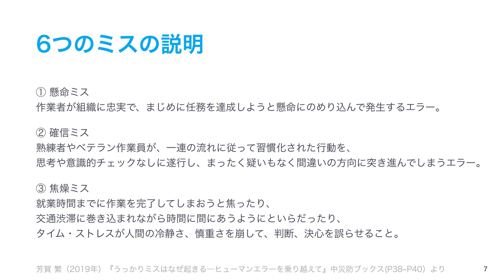 ͭͷϛεͷઆ໌ ᶃݒ໋ϛε ࡞ۀऀ͕৫ʹ࣮Ͱɺ·͡ΊʹΛୡ͠Α͏ͱݒ໋ʹͷΊΓࠐΜͰൃੜ͢ΔΤϥʔɻ ᶄ֬৴ϛε ख़࿅ऀϕςϥϯ࡞ۀһ͕ɺҰ࿈ͷྲྀΕʹैͬͯश׳Խ͞ΕͨߦಈΛɺ ࢥߟҙࣝతνΣοΫͳ͠ʹߦ͠ɺ·͍ͬͨٙ͘ͳؒ͘ҧ͍ͷํʹಥ͖ਐΜͰ͠·͏Τϥʔɻ ᶅয૩ϛε बۀ࣌ؒ·Ͱʹ࡞ۀΛྃͯ͠͠·͓͏ͱযͬͨΓɺ ަ௨ौʹר͖ࠐ·Εͳ͕Β࣌ؒʹؒʹ͋͏Α͏ʹͱ͍ΒͩͬͨΓɺ λΠϜɾετϨε͕ਓؒͷྫྷ੩͞ɺ৻ॏ͞Λ่ͯ͠ɺஅɺܾ৺ΛޡΒͤΔ͜ͱɻ