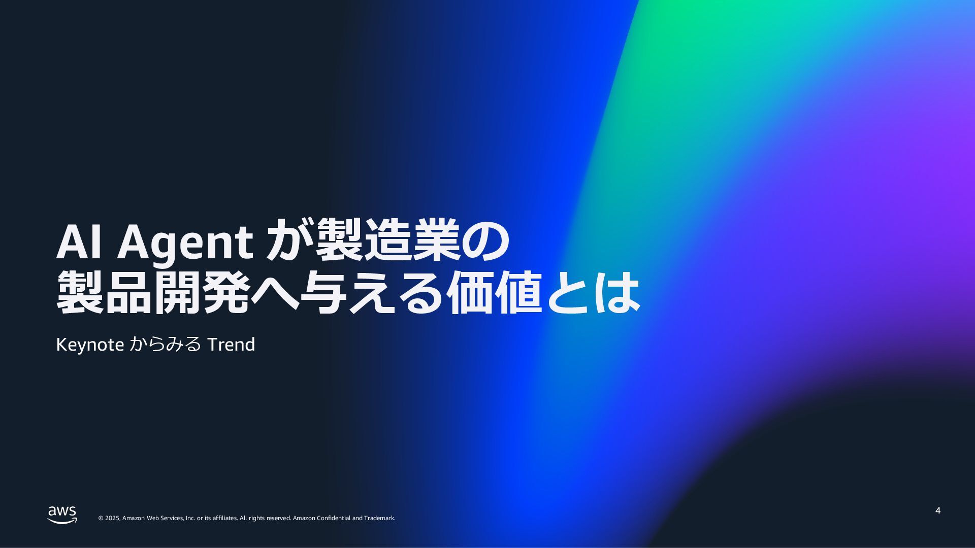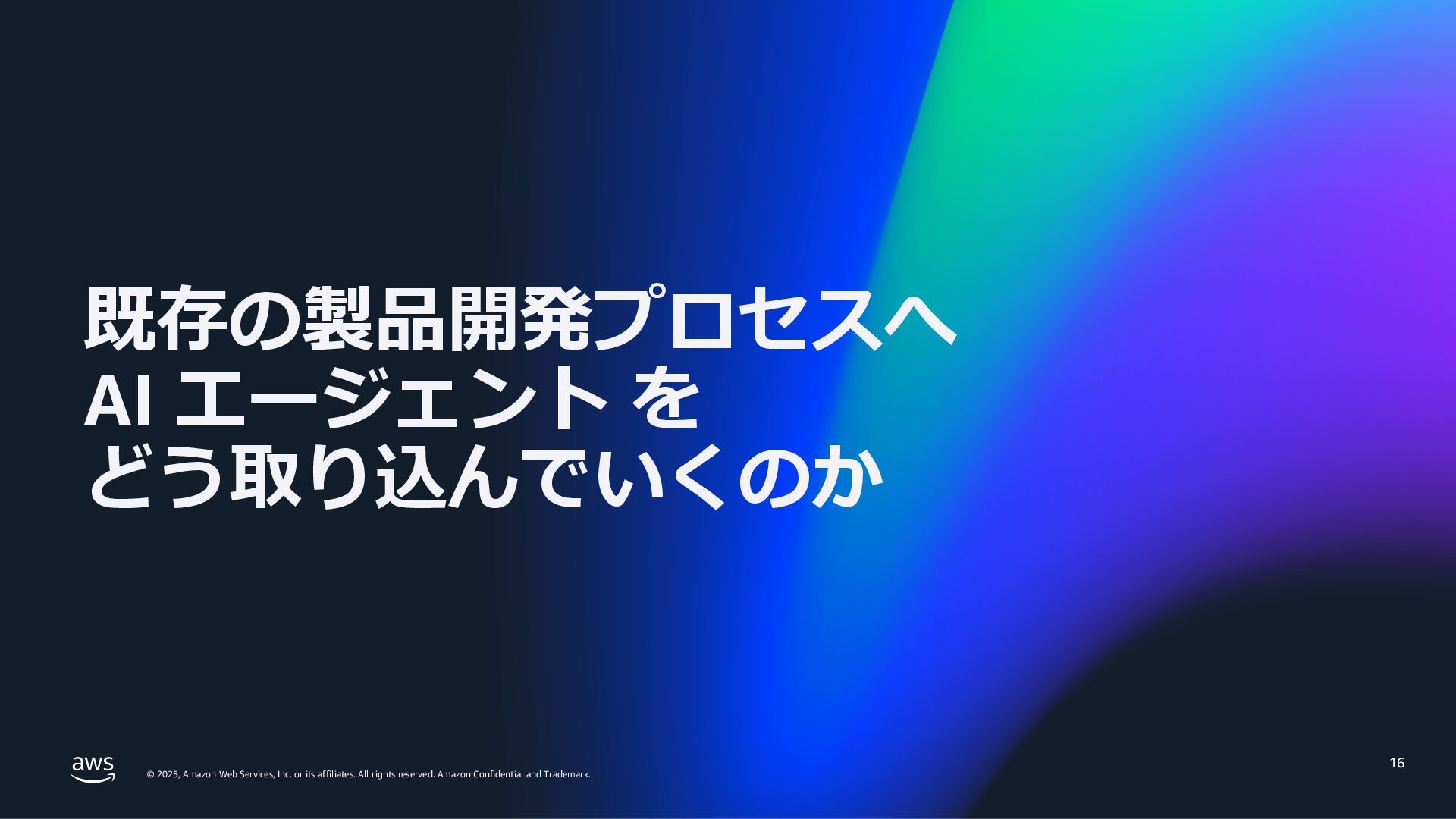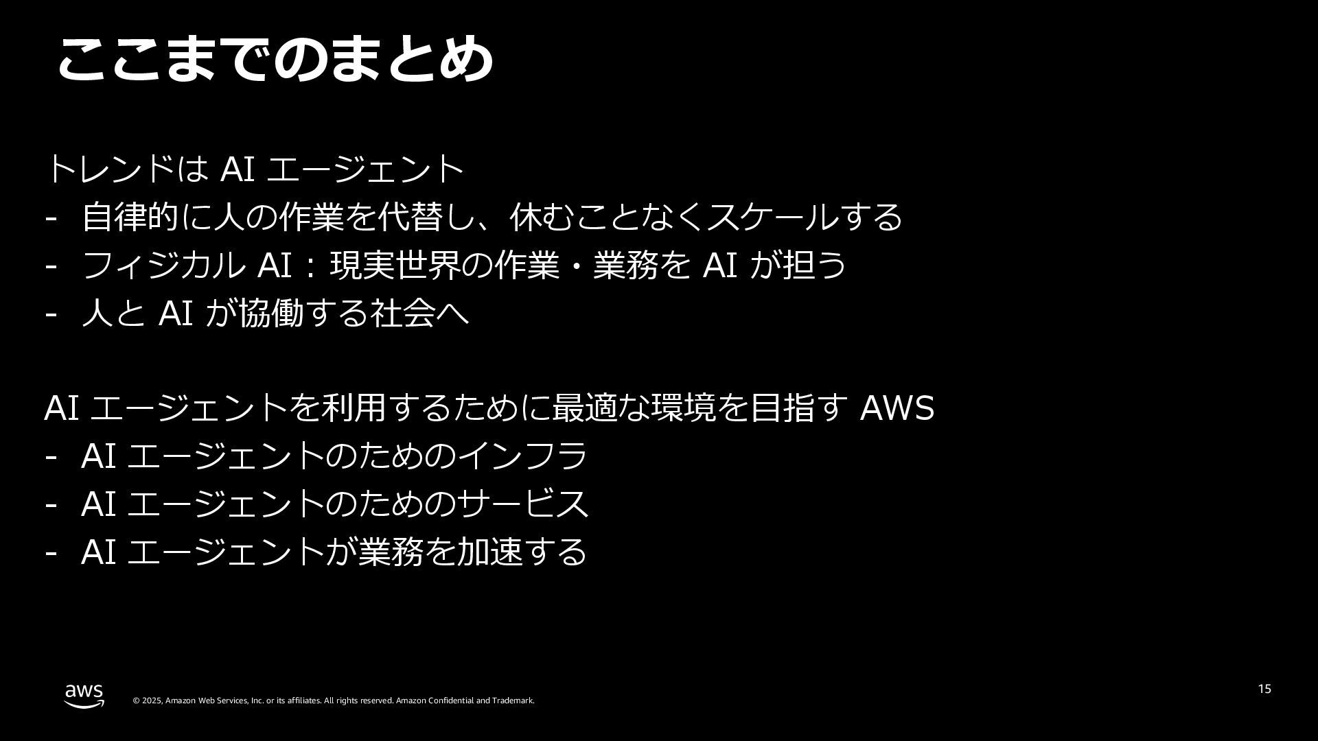 rights reserved. Amazon Confidential and Trademark. 15 ここまでのまとめ トレンドは AI エージェント - ⾃律的に⼈の作業を代替し、休むことなくスケールする - フィジカル AI : 現実世界の作業・業務を AI が担う - ⼈と AI が協働する社会へ AI エージェントを利⽤するために最適な環境を⽬指す AWS - AI エージェントのためのインフラ - AI エージェントのためのサービス - AI エージェントが業務を加速する