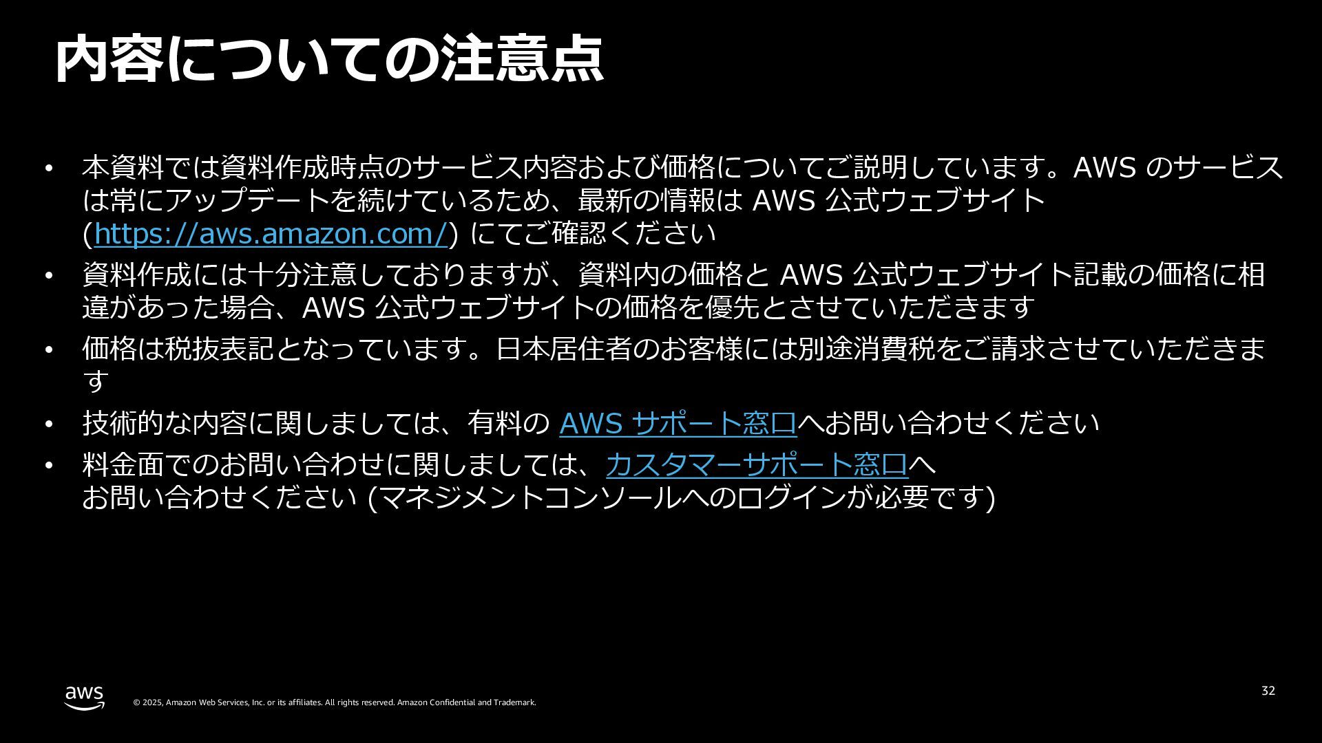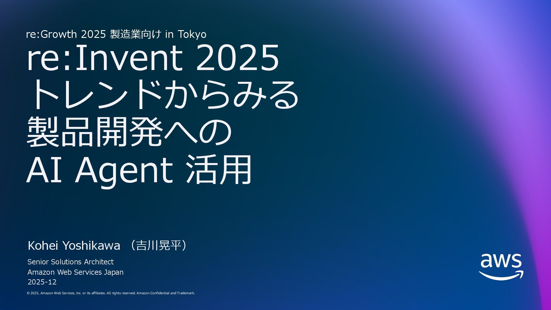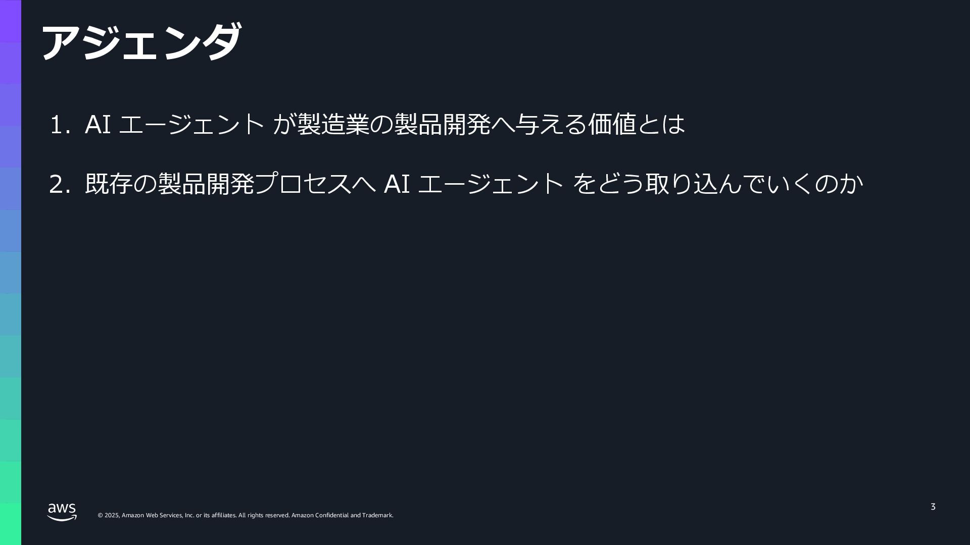 rights reserved. Amazon Confidential and Trademark. 15 ここまでのまとめ トレンドは AI エージェント - ⾃律的に⼈の作業を代替し、休むことなくスケールする - フィジカル AI : 現実世界の作業・業務を AI が担う - ⼈と AI が協働する社会へ AI エージェントを利⽤するために最適な環境を⽬指す AWS - AI エージェントのためのインフラ - AI エージェントのためのサービス - AI エージェントが業務を加速する