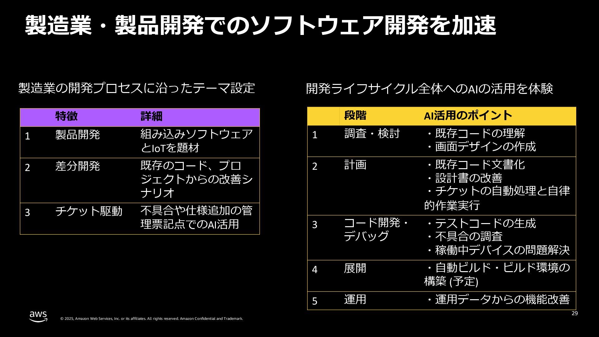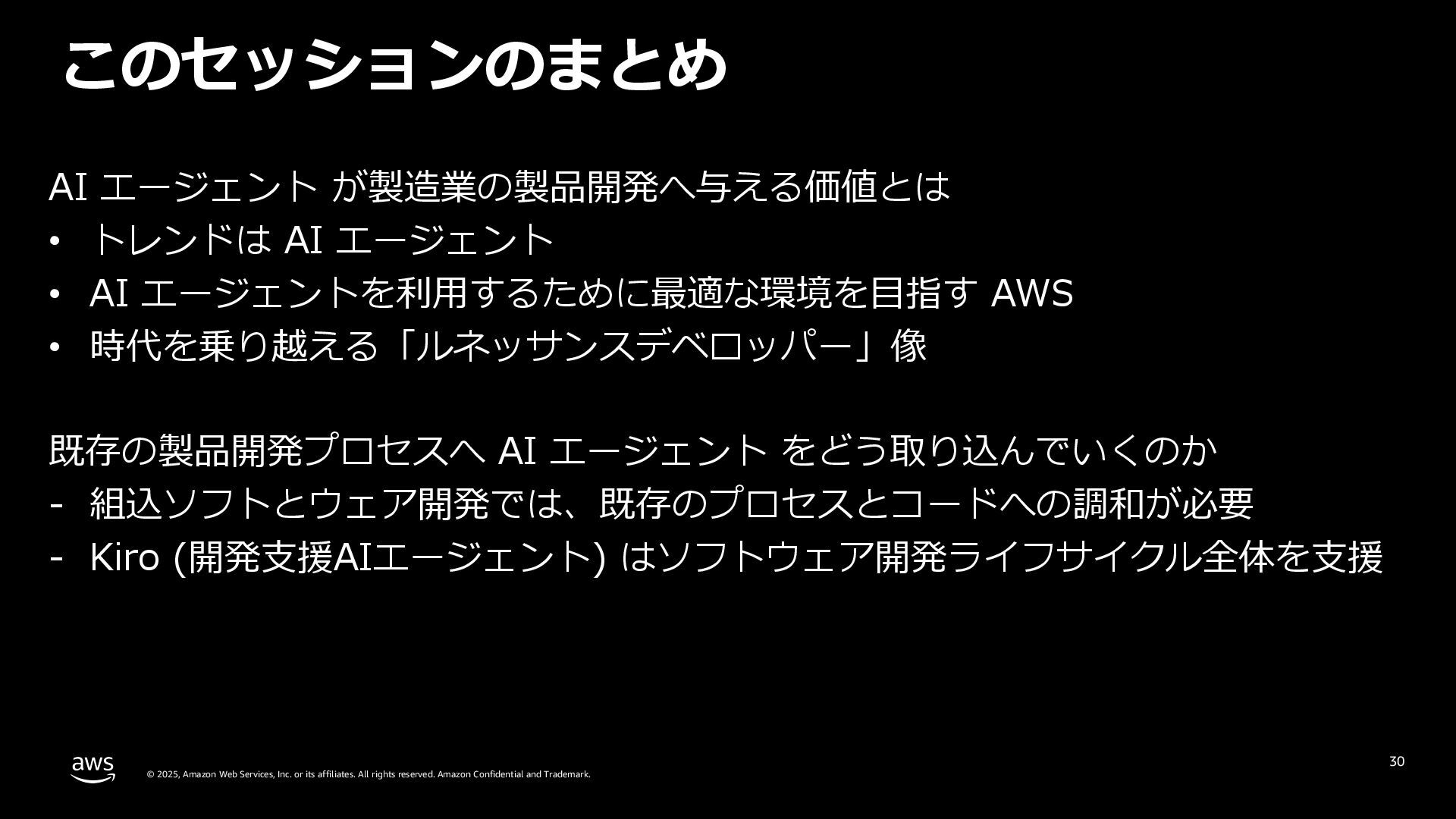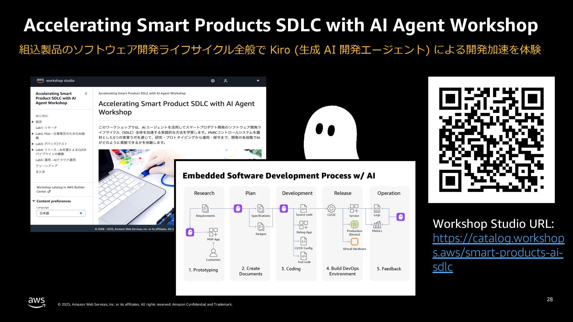 rights reserved. Amazon Confidential and Trademark. 組込製品のソフトウェア開発ライフサイクル全般で Kiro (⽣成 AI 開発エージェント) による開発加速を体験 28 Accelerating Smart Products SDLC with AI Agent Workshop Workshop Studio URL: https://catalog.workshop s.aws/smart-products-ai- sdlc