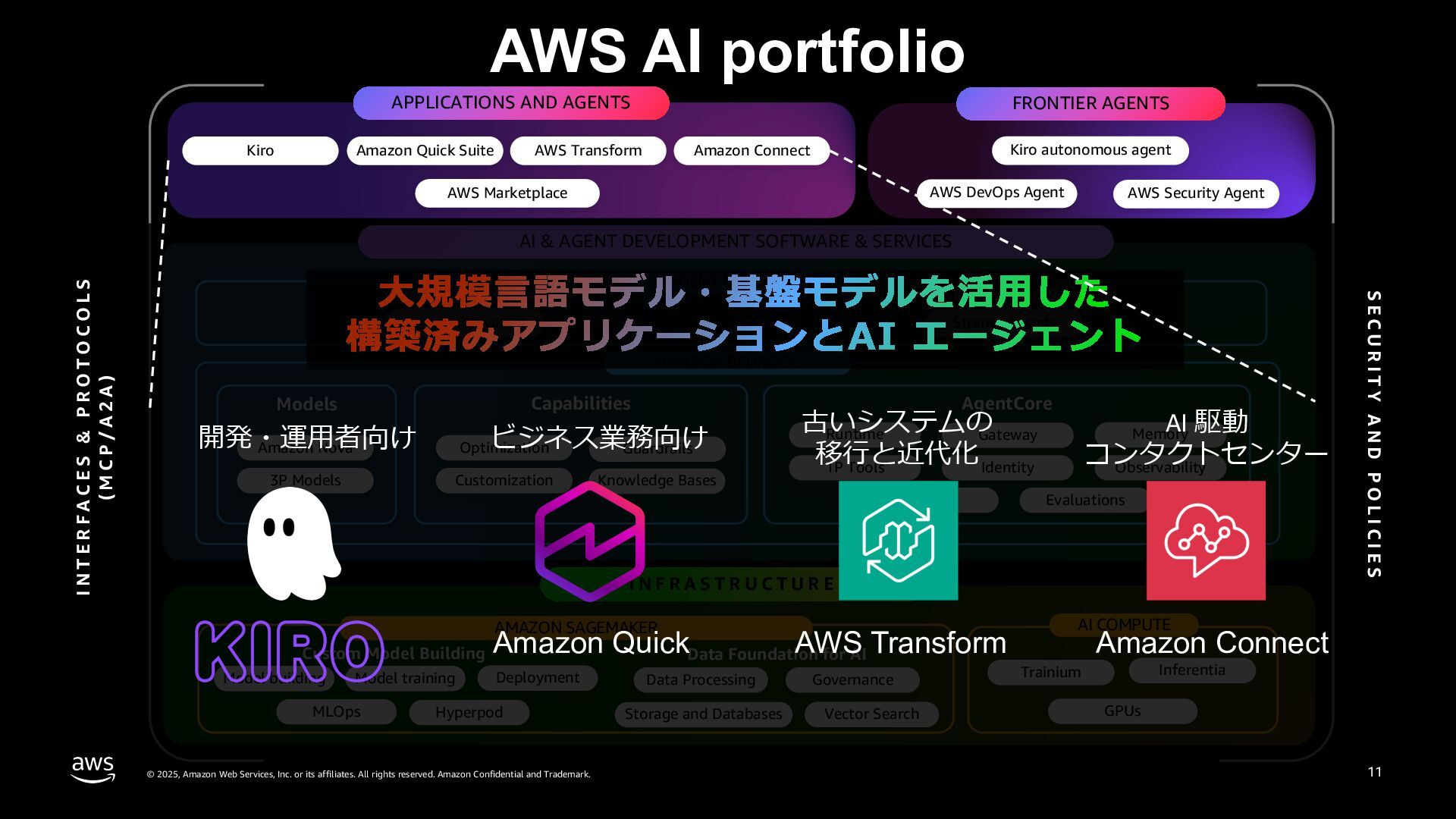rights reserved. Amazon Confidential and Trademark. AWS AI portfolio AI & AGENT DEVELOPMENT SOFTWARE & SERVICES AGENT BUILDERS Vertically Integrated Flexible/OSS AMAZON BEDROCK Models Capabilities AgentCore Amazon Nova 3P Models Optimization Guardrails Customization Runtime 1P Tools Gateway Identity Memory Observability Kiro Amazon Quick Suite AWS Transform Amazon Connect Kiro autonomous agent I N T E R F A C E S & P R O T O C O L S ( M C P / A 2 A ) Amazon Nova Act Strands Agents AI COMPUTE Trainium MLOps Model training Deployment Model building Inferentia GPUs Vector Search Governance Storage and Databases Data Processing Hyperpod AMAZON SAGEMAKER Custom Model Building Data Foundation for AI APPLICATIONS AND AGENTS AWS Security Agent AWS DevOps Agent AWS Marketplace FRONTIER AGENTS Knowledge Bases Policy Evaluations S E C U R I T Y A N D P O L I C I E S 11 I N F R A S T R U C T U R E 開発・運⽤者向け ビジネス業務向け AI 駆動 コンタクトセンター 古いシステムの 移⾏と近代化 Amazon Connect AWS Transform Amazon Quick