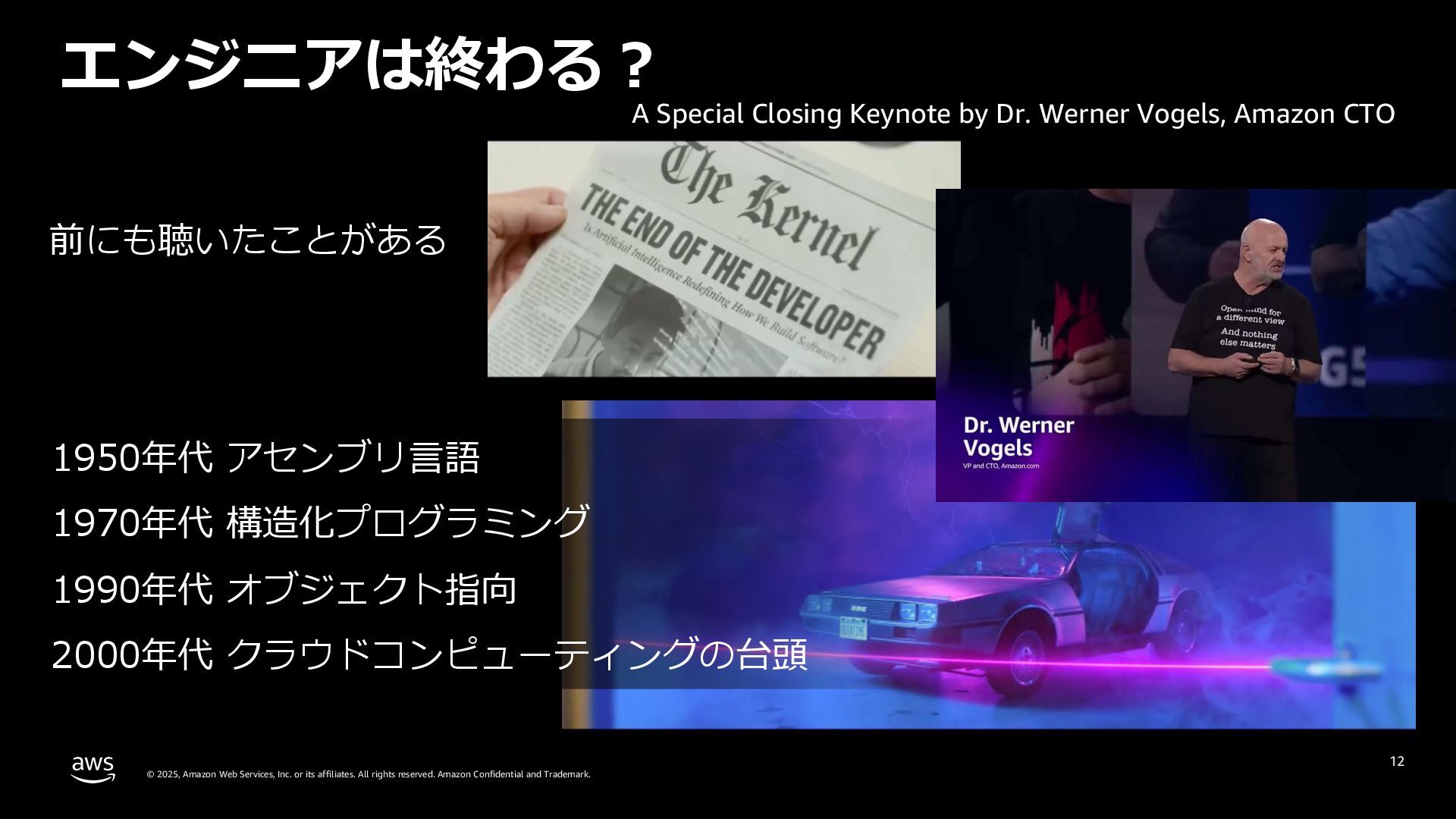 rights reserved. Amazon Confidential and Trademark. 12 エンジニアは終わる︖ 1950年代 アセンブリ⾔語 1970年代 構造化プログラミング 1990年代 オブジェクト指向 2000年代 クラウドコンピューティングの台頭 前にも聴いたことがある A Special Closing Keynote by Dr. Werner Vogels, Amazon CTO