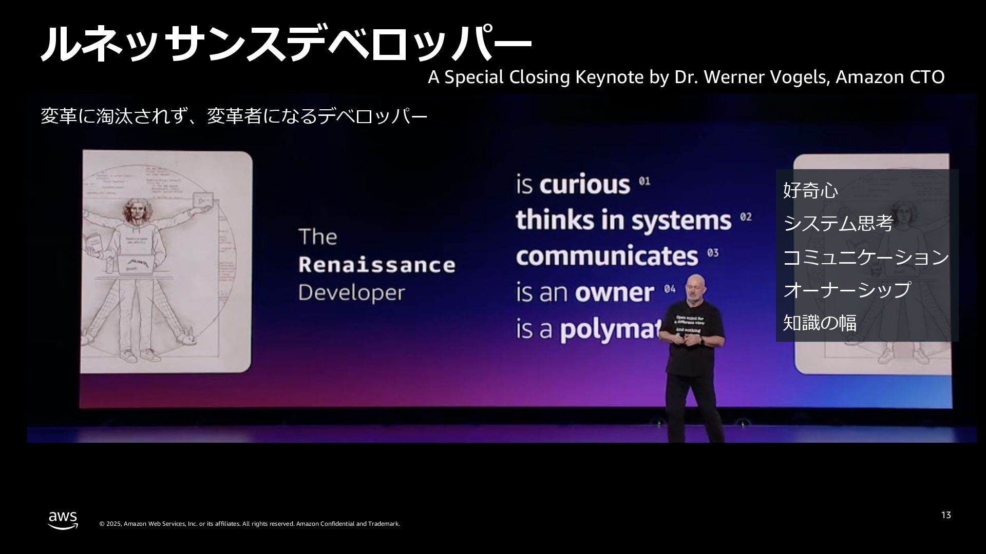rights reserved. Amazon Confidential and Trademark. 13 ルネッサンスデベロッパー 好奇⼼ システム思考 コミュニケーション オーナーシップ 知識の幅 変⾰に淘汰されず、変⾰者になるデベロッパー A Special Closing Keynote by Dr. Werner Vogels, Amazon CTO
